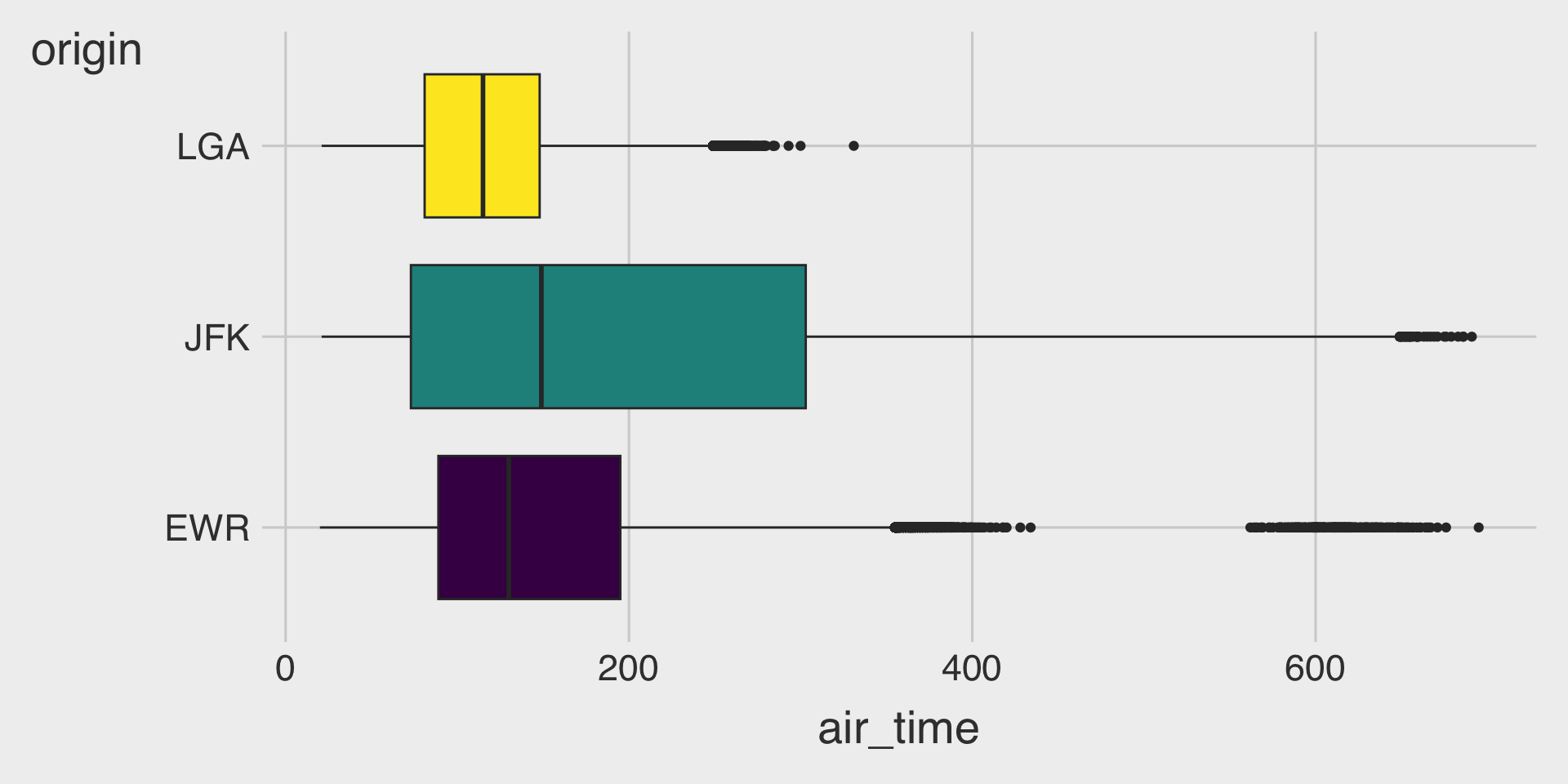 π€ Task: Fill in the blanks in the provided ggplot() code chunk to visualize how the distribution of air_time (minutes spent in the air) varies by origin.