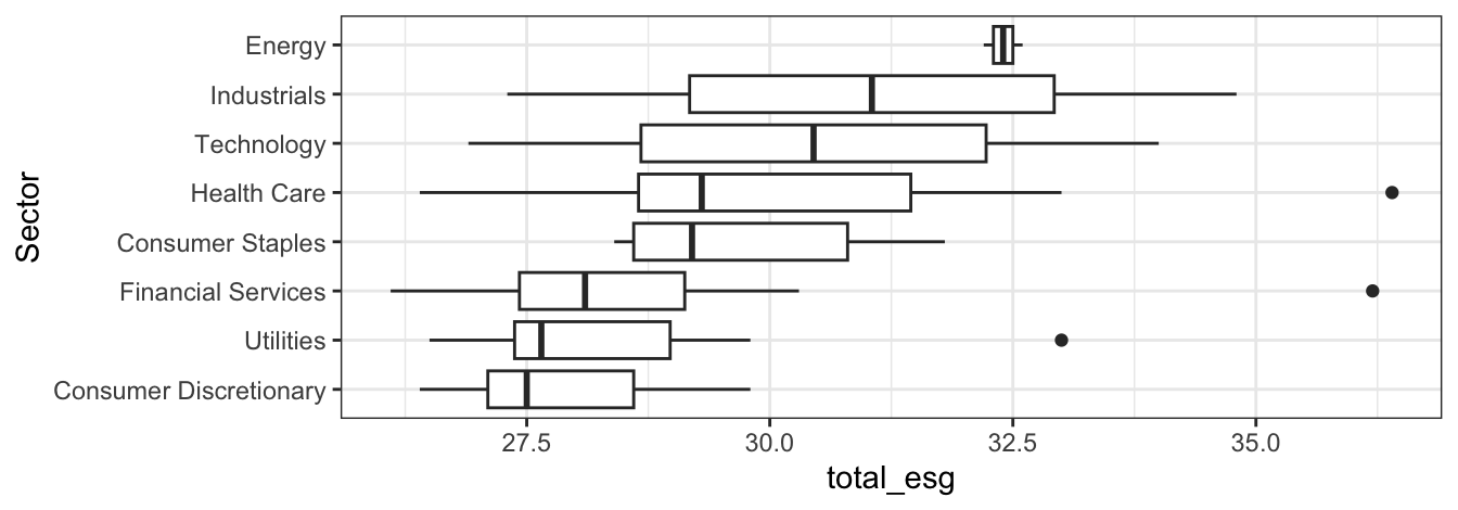 fct_reorder(total_esg, sector)fct_reorder(environmental, total_esg)fct_reorder(total_esg, social)fct_reorder(governance, total_esg)fct_reorder(total_esg, controversy)fct_reorder(sector, total_esg)