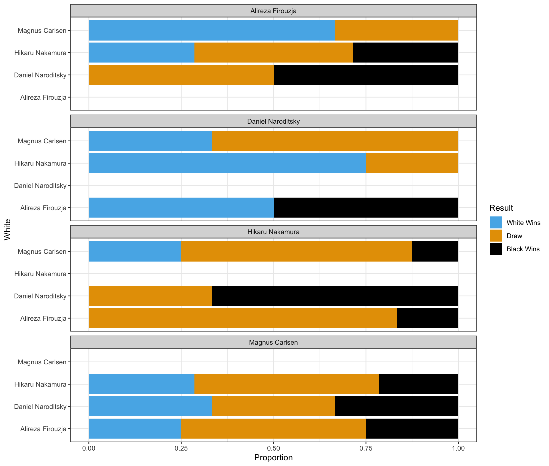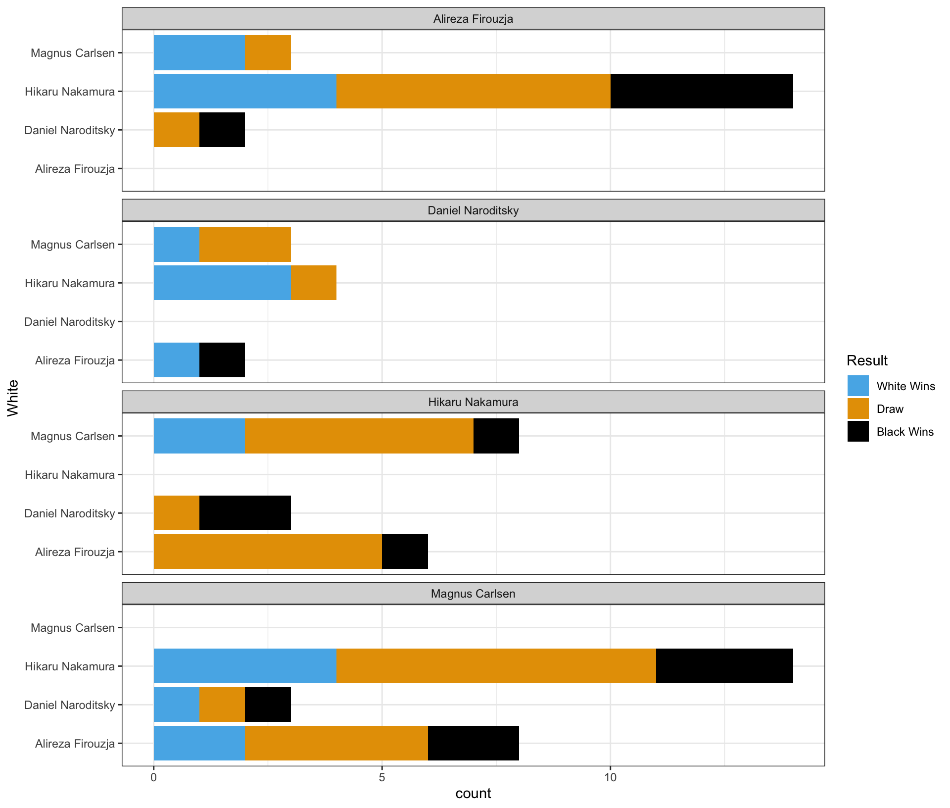 For Question 20, you will use the following R packages and a data.frame named chess_top4, which contains information about chess games played by four of the world’s top online chess players during a special event called “Titled Tuesday” on chess.com. These games were played in a format where each player has 3 minutes to make all their moves, with 1 second added to their clock after each move. The data includes games from October 2022 to October 2024 played only among the following four players: