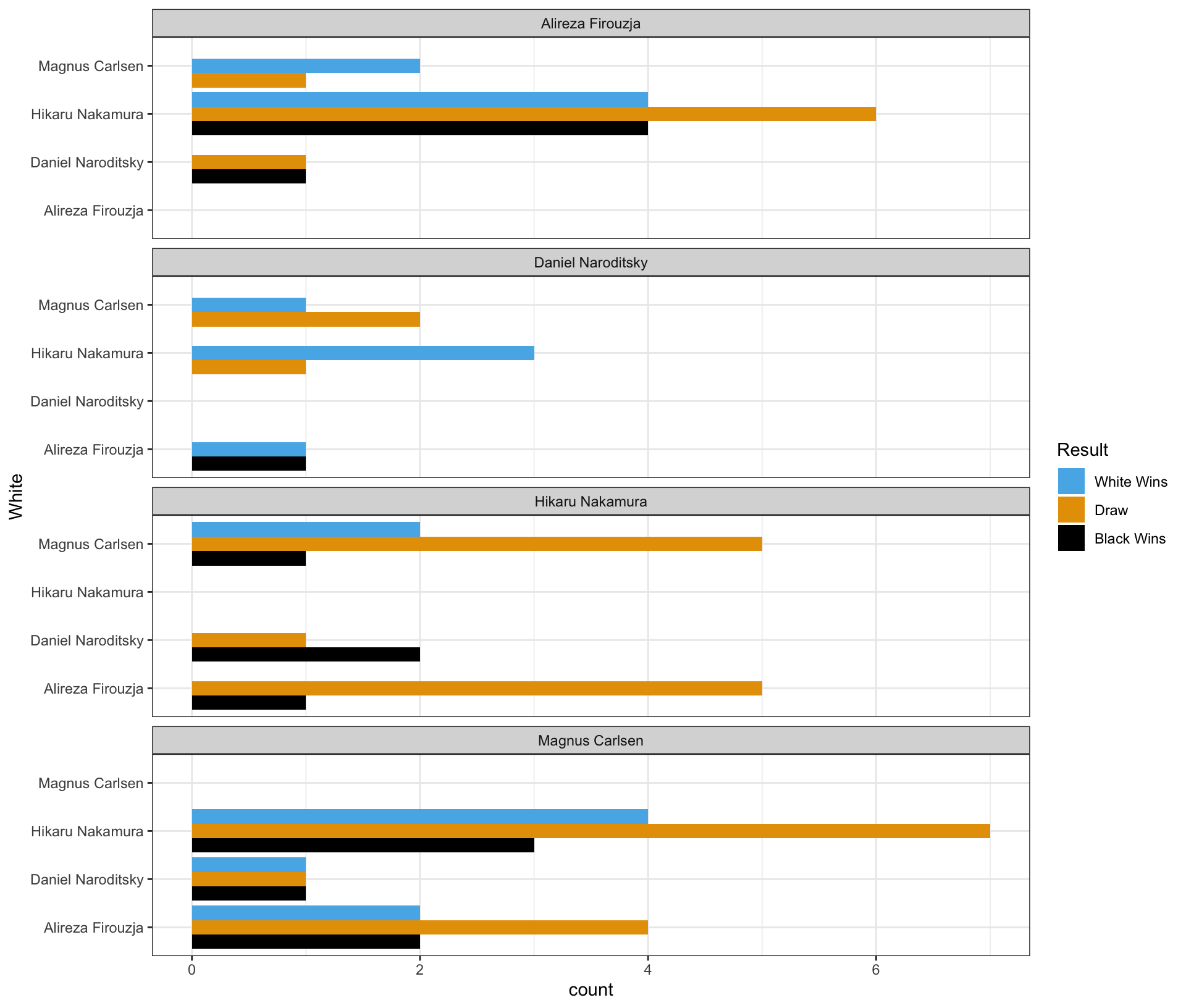 For Question 20, you will use the following R packages and a data.frame named chess_top4, which contains information about chess games played by four of the world’s top online chess players during a special event called “Titled Tuesday” on chess.com. These games were played in a format where each player has 3 minutes to make all their moves, with 1 second added to their clock after each move. The data includes games from October 2022 to October 2024 played only among the following four players:
