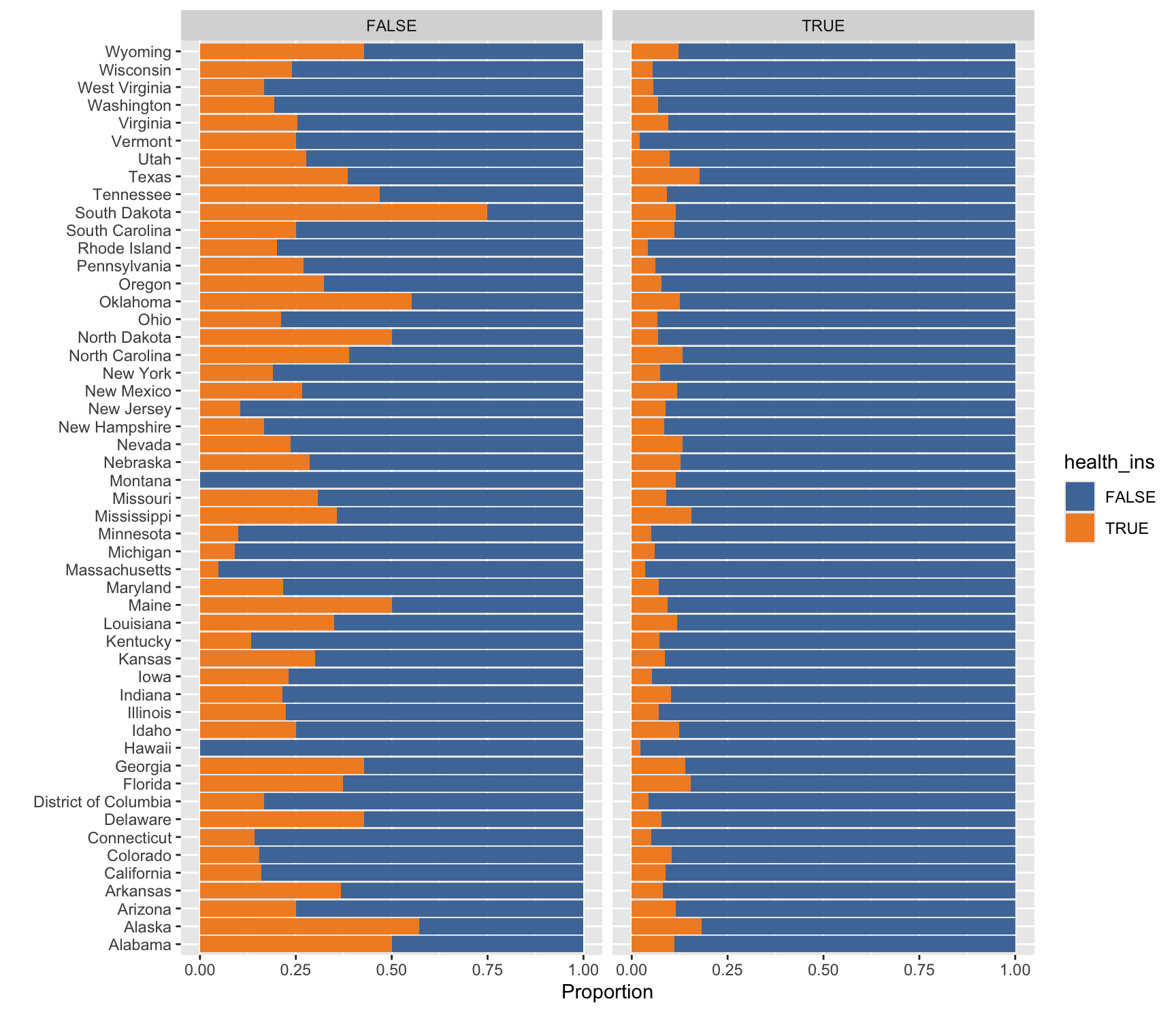 Here we describe how the distribution of health_ins varies by state of residence and employment status using the health_cust data.frame. Complete the code by filling in the blanks (1)-(4).