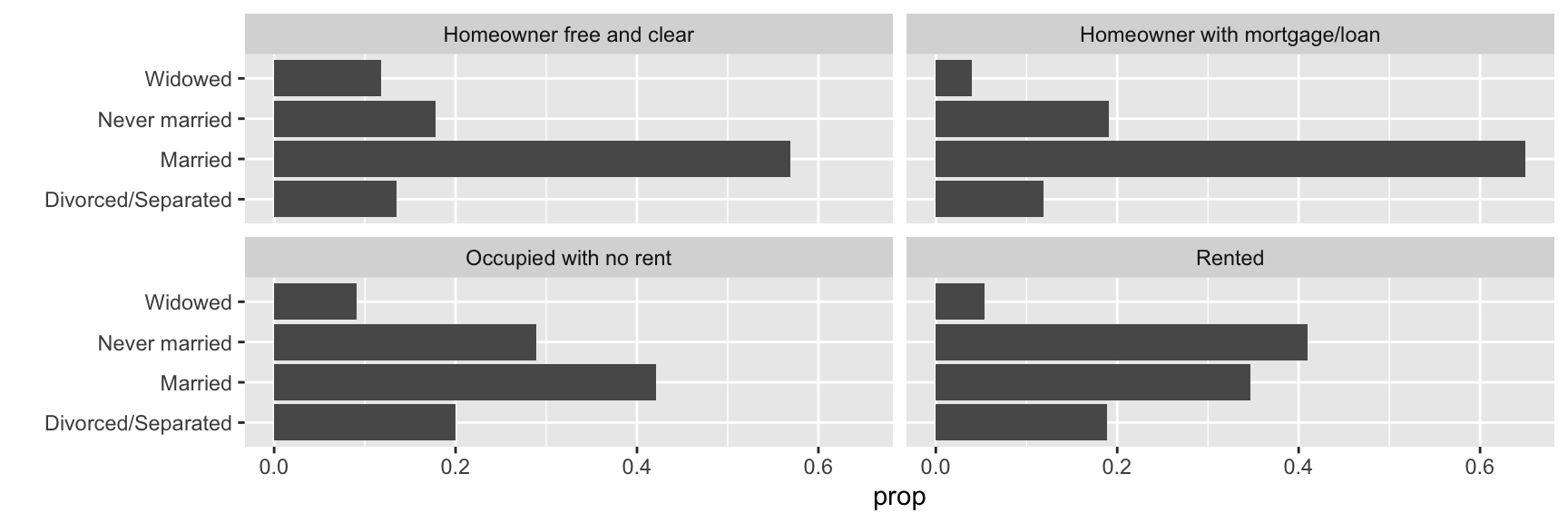 Here we describe how the distribution of marital_status varies by housing_type using the health_cust data.frame. Complete the code by filling in the blanks (1)-(4).