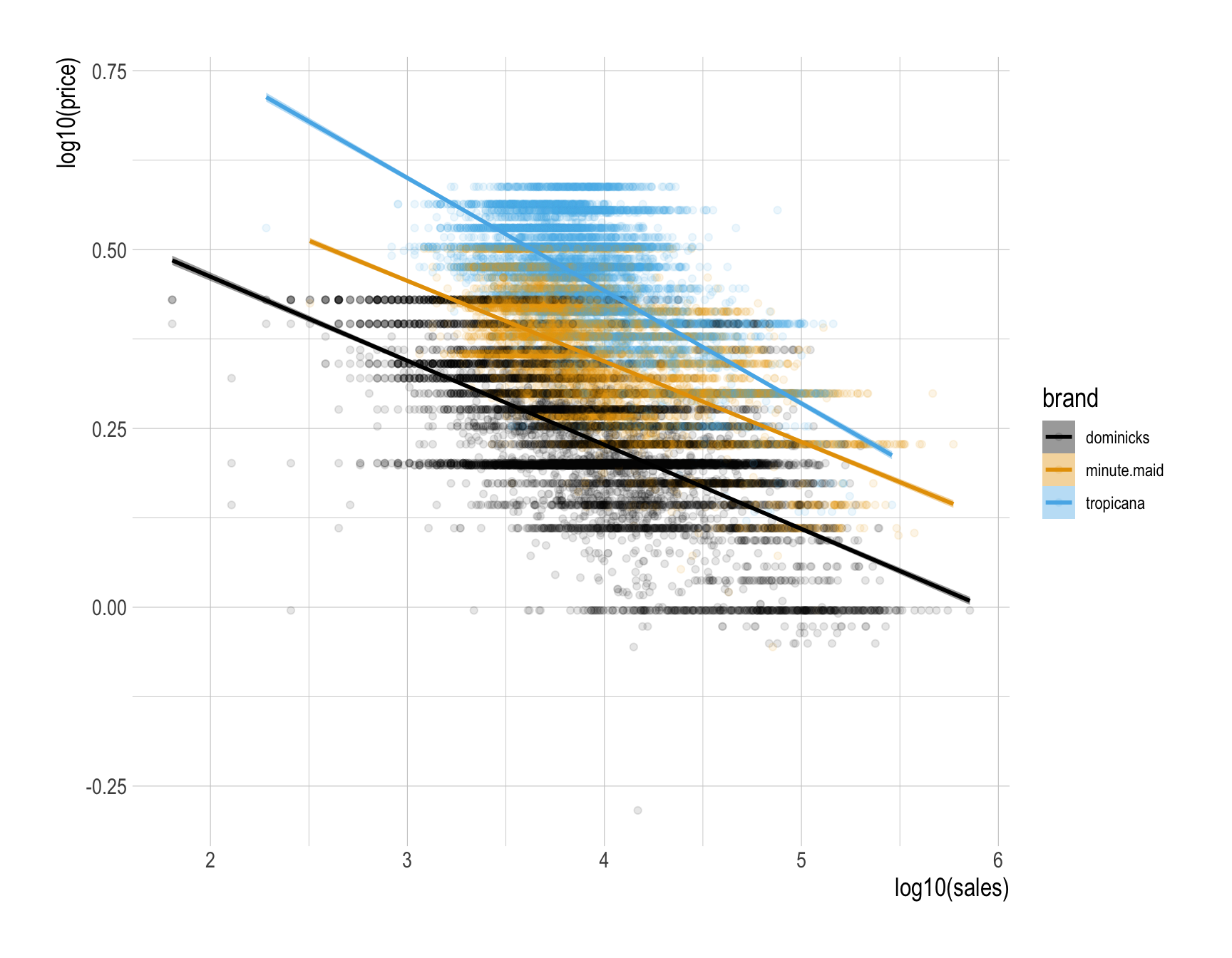 How would you describe how the relationship between (1) the base-10 log of sales and (2) the base-10 log of price varies by brand?