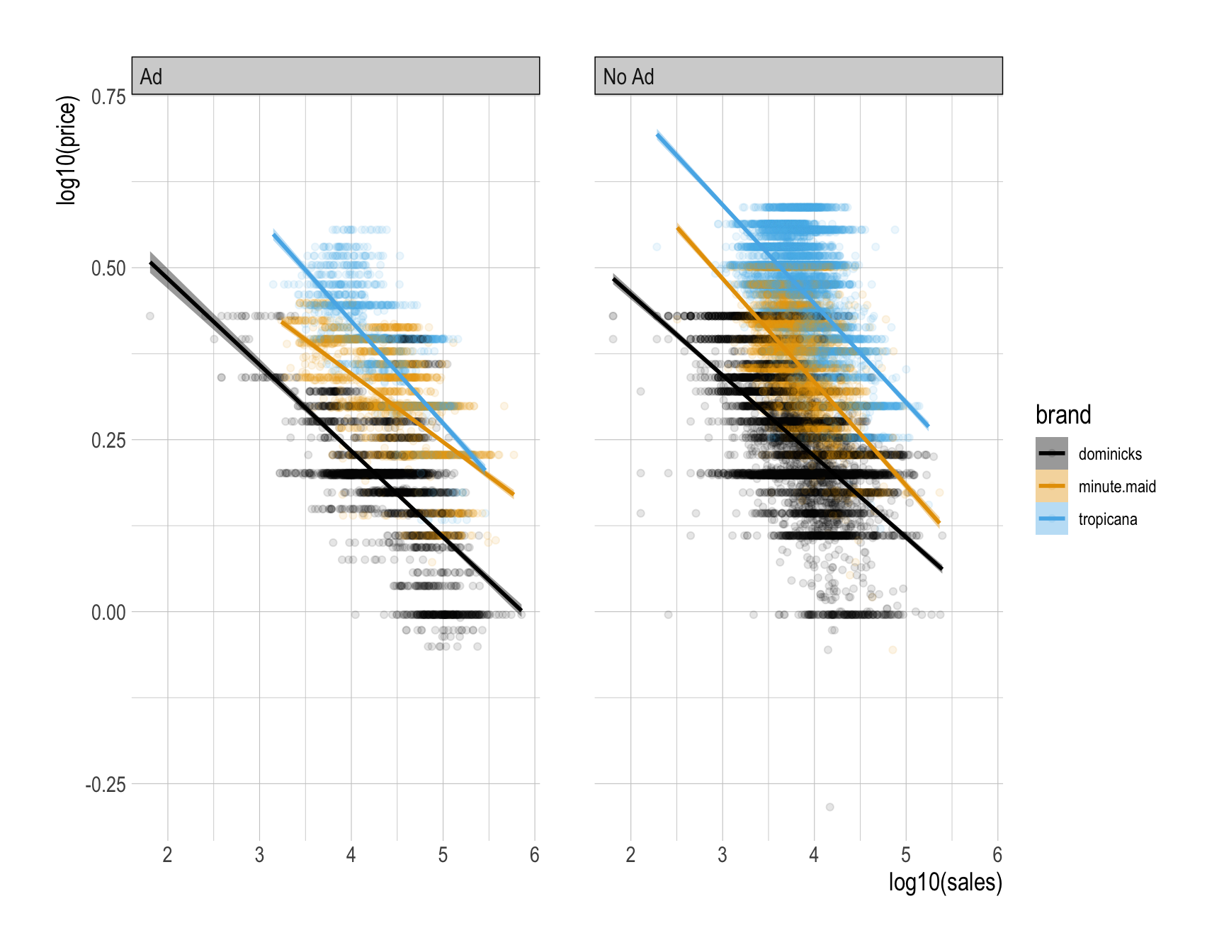 How would you visualize how the relationship between (1) the base-10 log of sales and (2) the base-10 log of price varies by brand and ad_status?