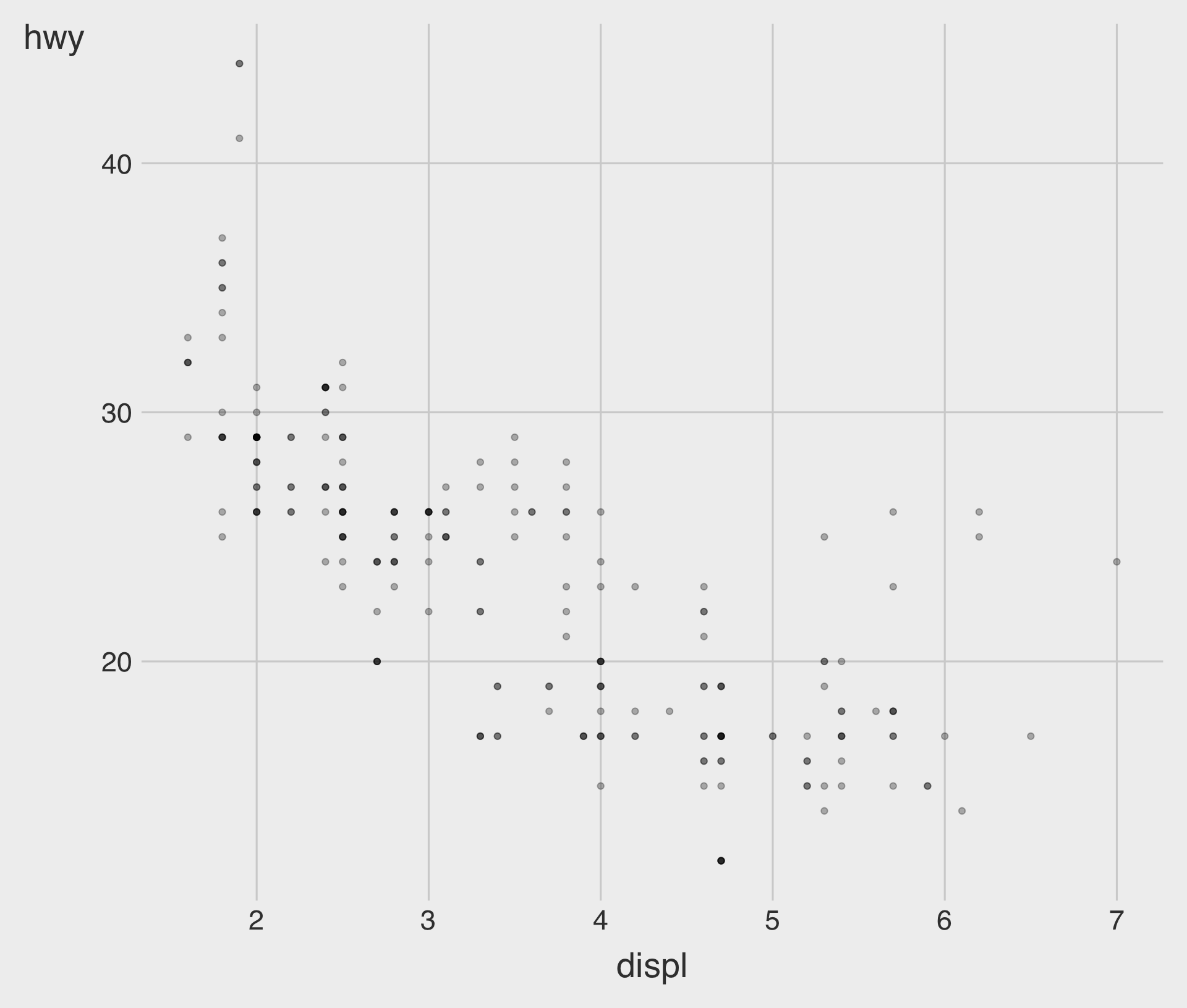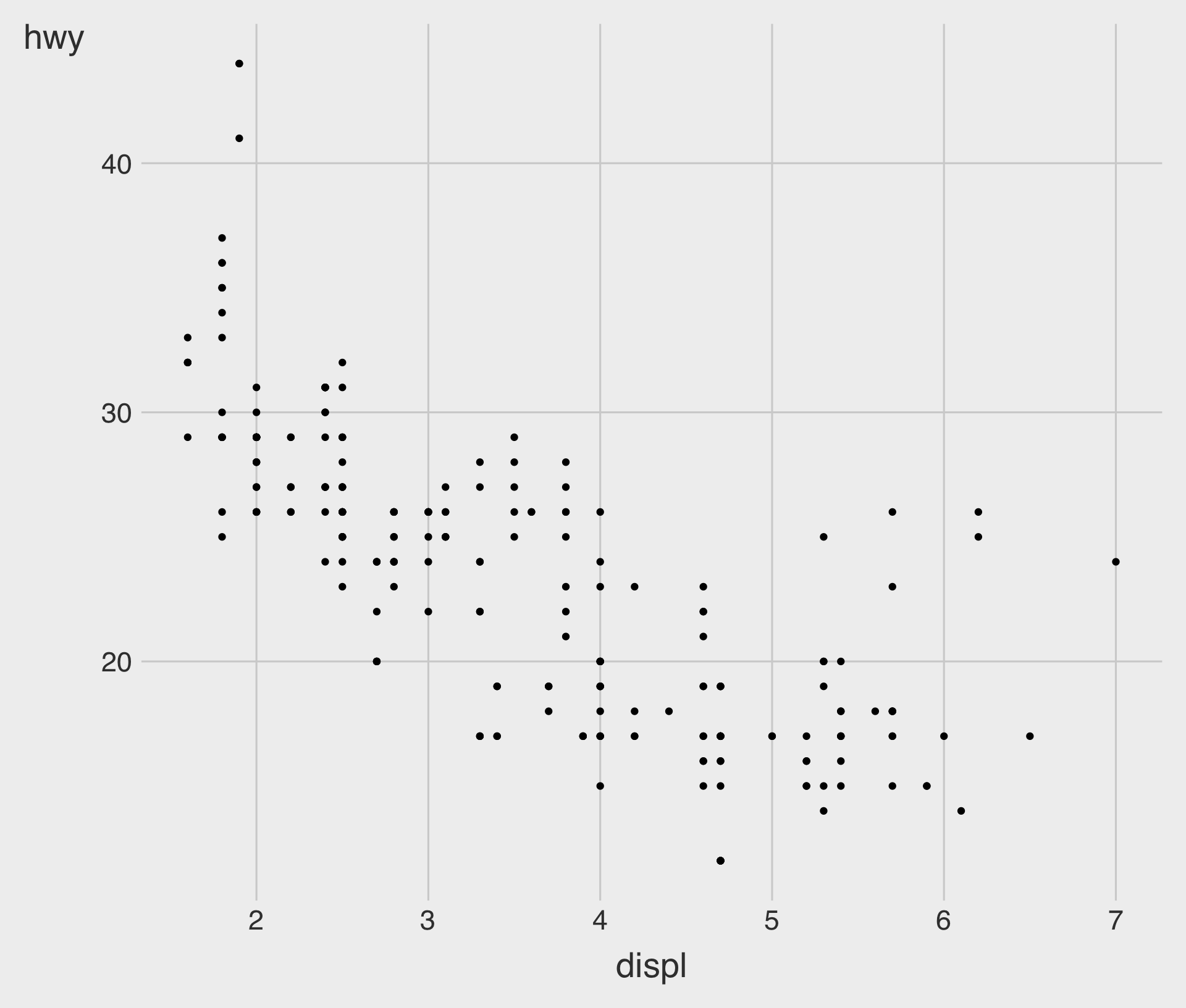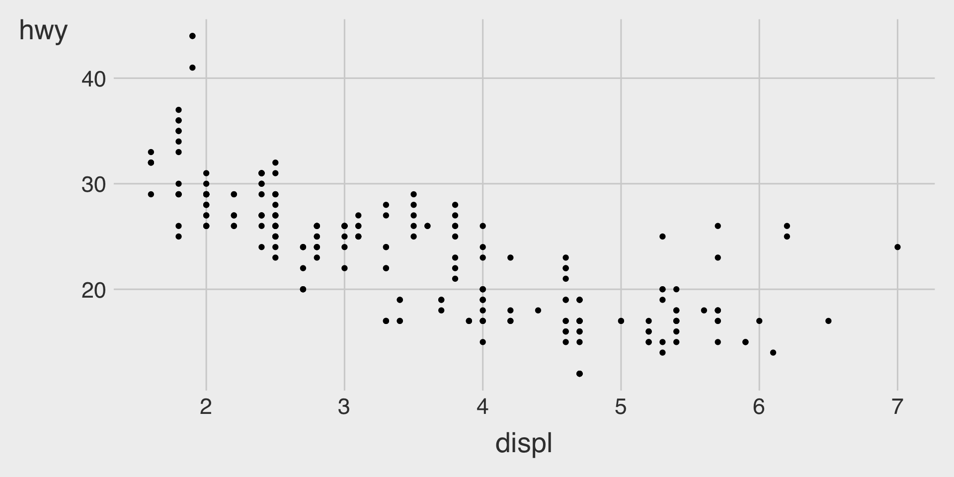 ggplotmpg, run the above code to put displ on the x-axis and hwy on the y-axis.A ggplot graphic is a mapping of variables in data to aesthetic attributes of geometric objects.