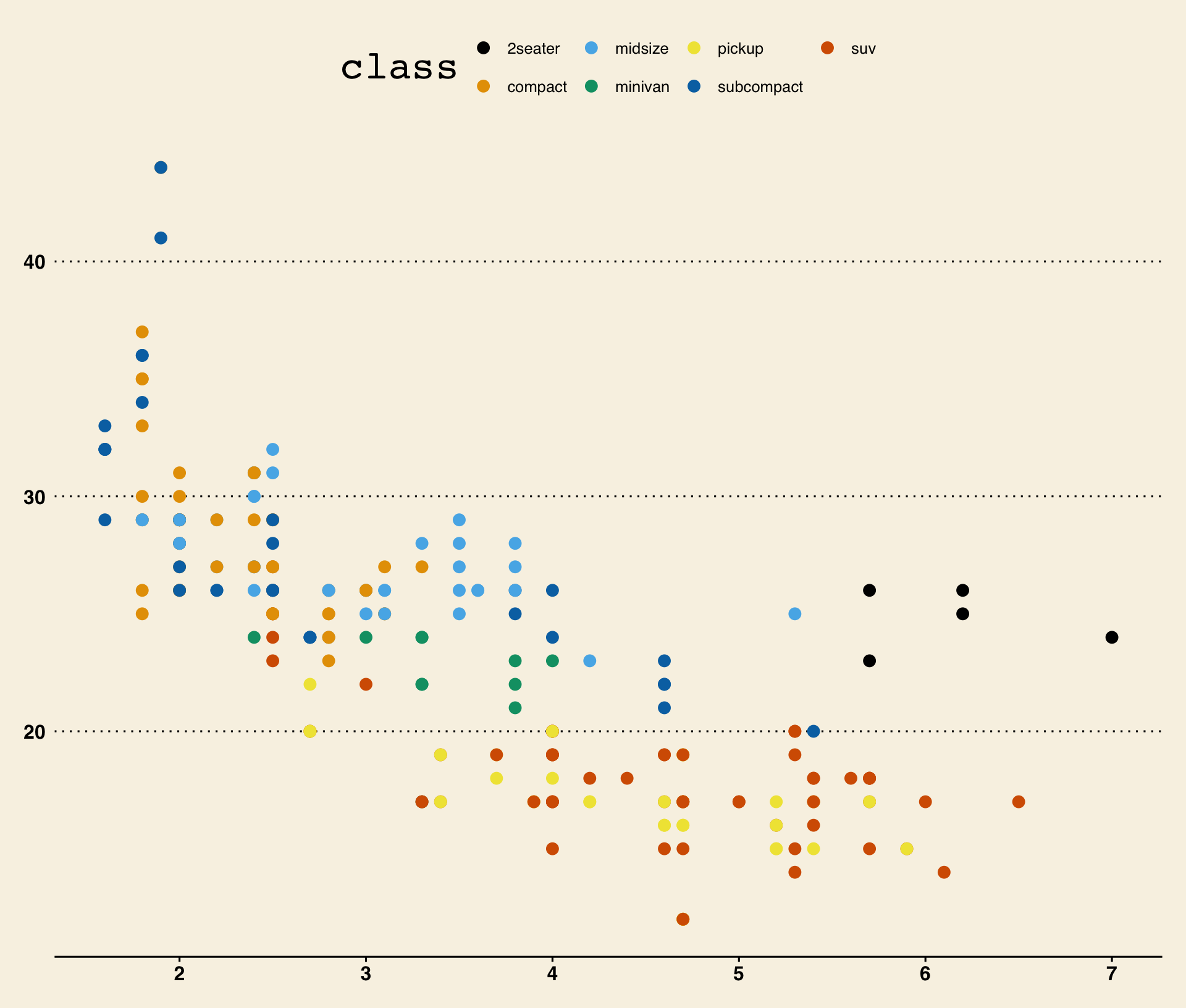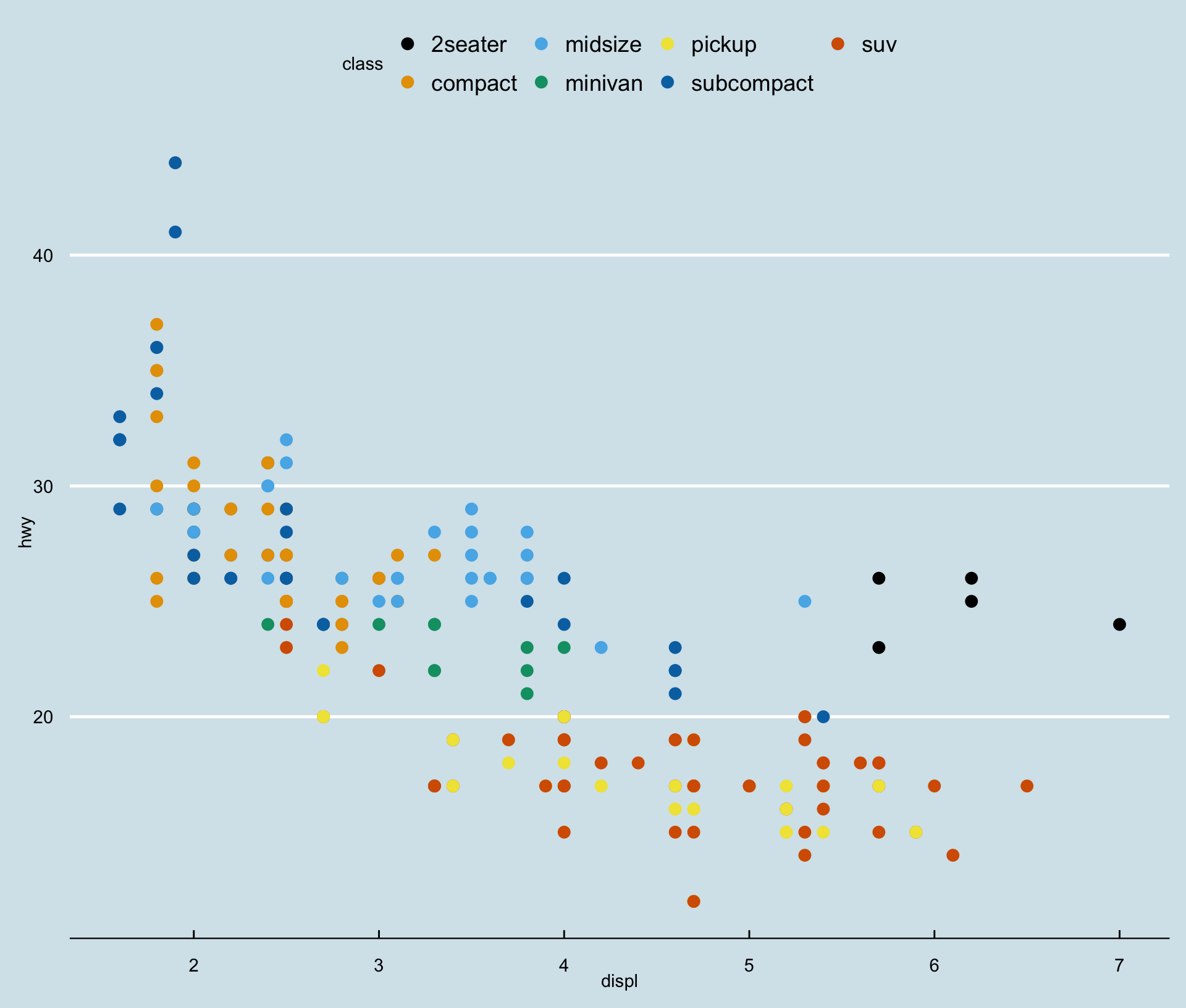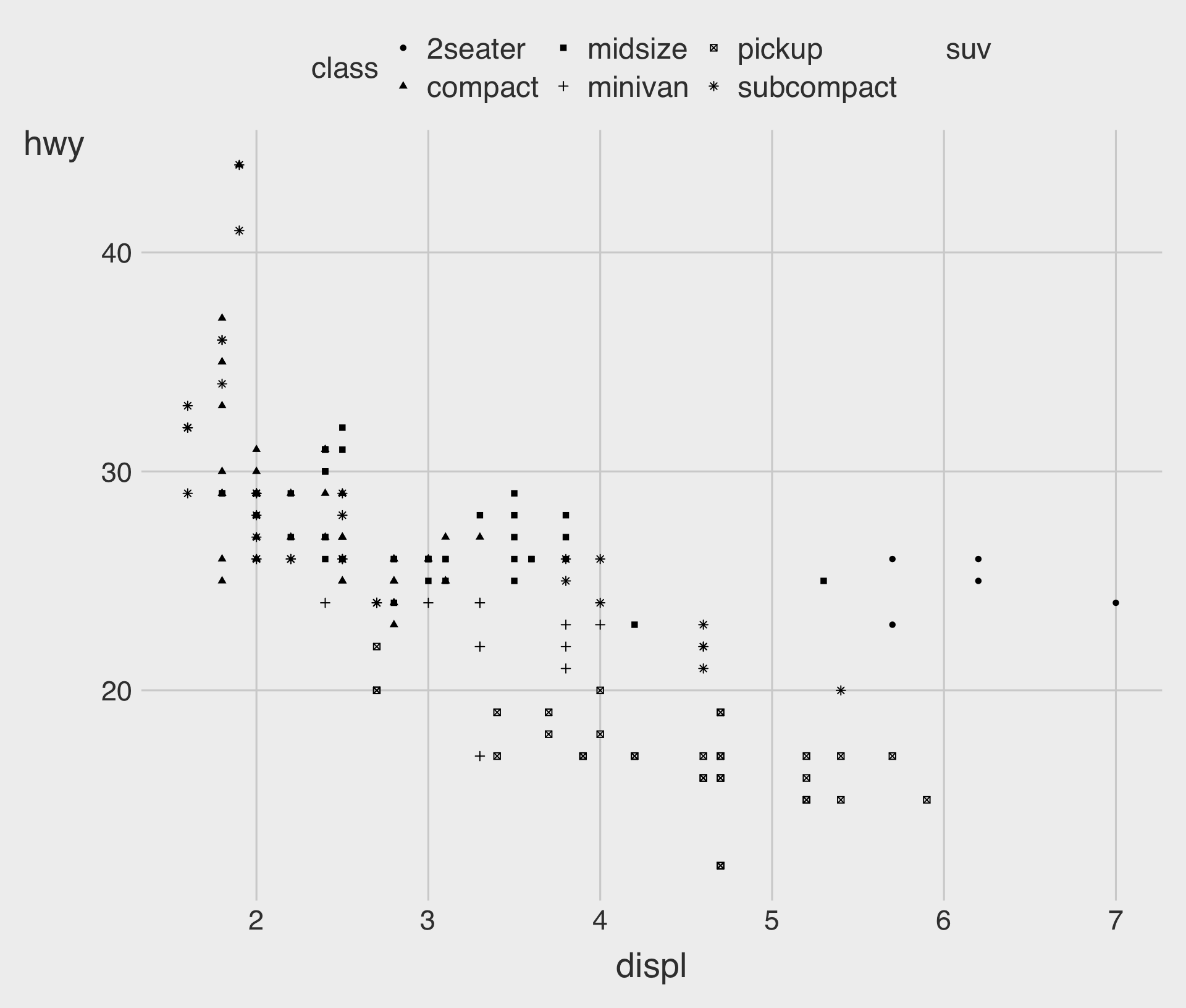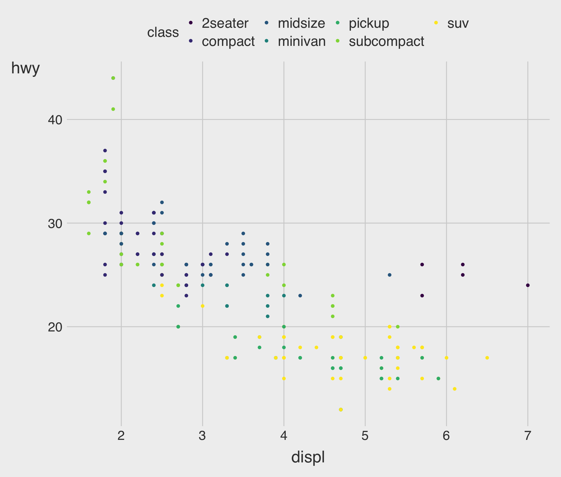 ggplotmpg, run the above code to put displ on the x-axis and hwy on the y-axis.A ggplot graphic is a mapping of variables in data to aesthetic attributes of geometric objects.