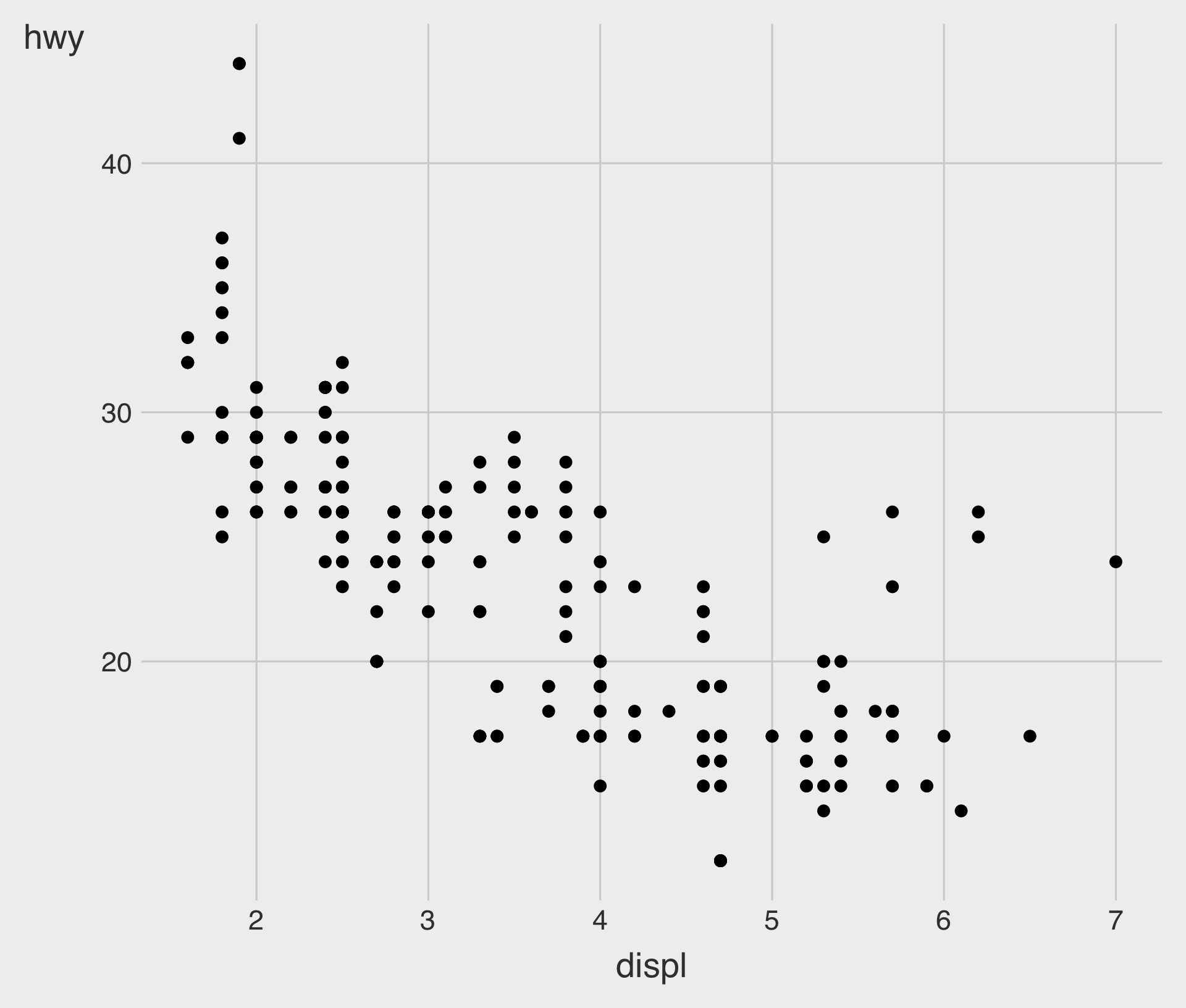displ: a car’s engine size, in liters.hwy: a car’s fuel efficiency on the highway, in miles per gallon (mpg).What does the relationship between engine size and fuel efficiency look like?