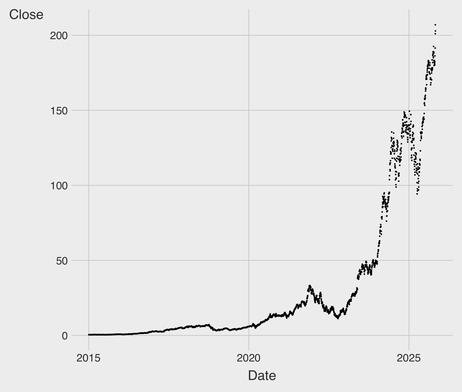 scales = "free" allow for different scales of both x-axis and y-axisggplot()nvda data.frame includes NVIDIA’s stock information from 2019-01-02 to 2025-10-30.geom_line()