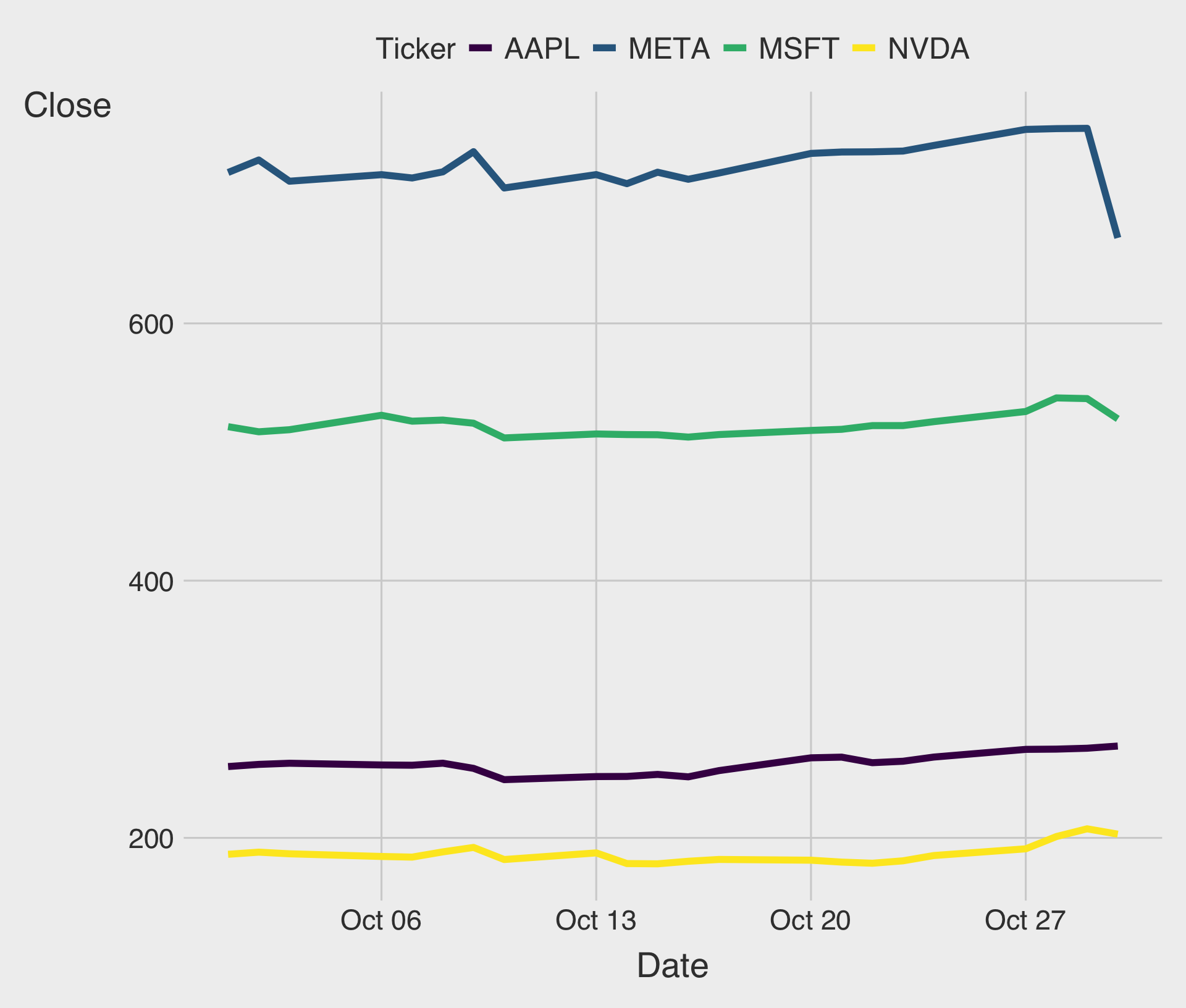 geom_smooth() helps reveal underlying long-term trends by smoothing out variability in the observations.tech_october data.frame includes stock information about AAPL, MSFT, META, and NVDA in October 2025.