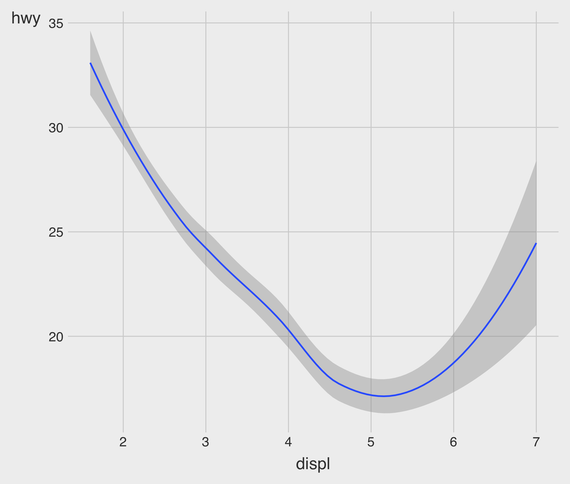 data = mpggeom_point()aes(x = displ, y = hwy)ggplot()geom_point()geom_smooth()geom_point() with geom_smooth()