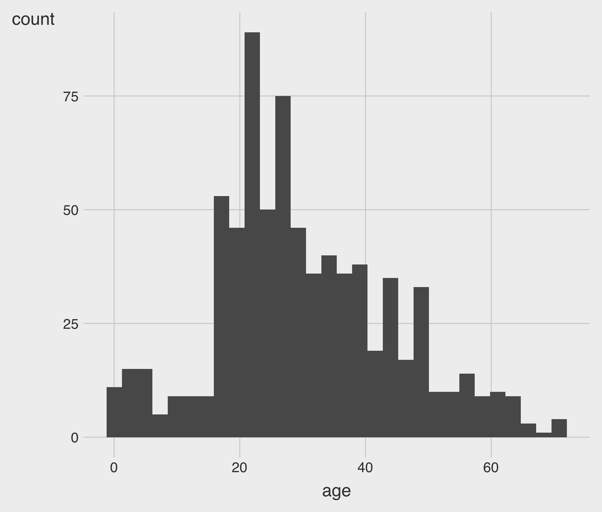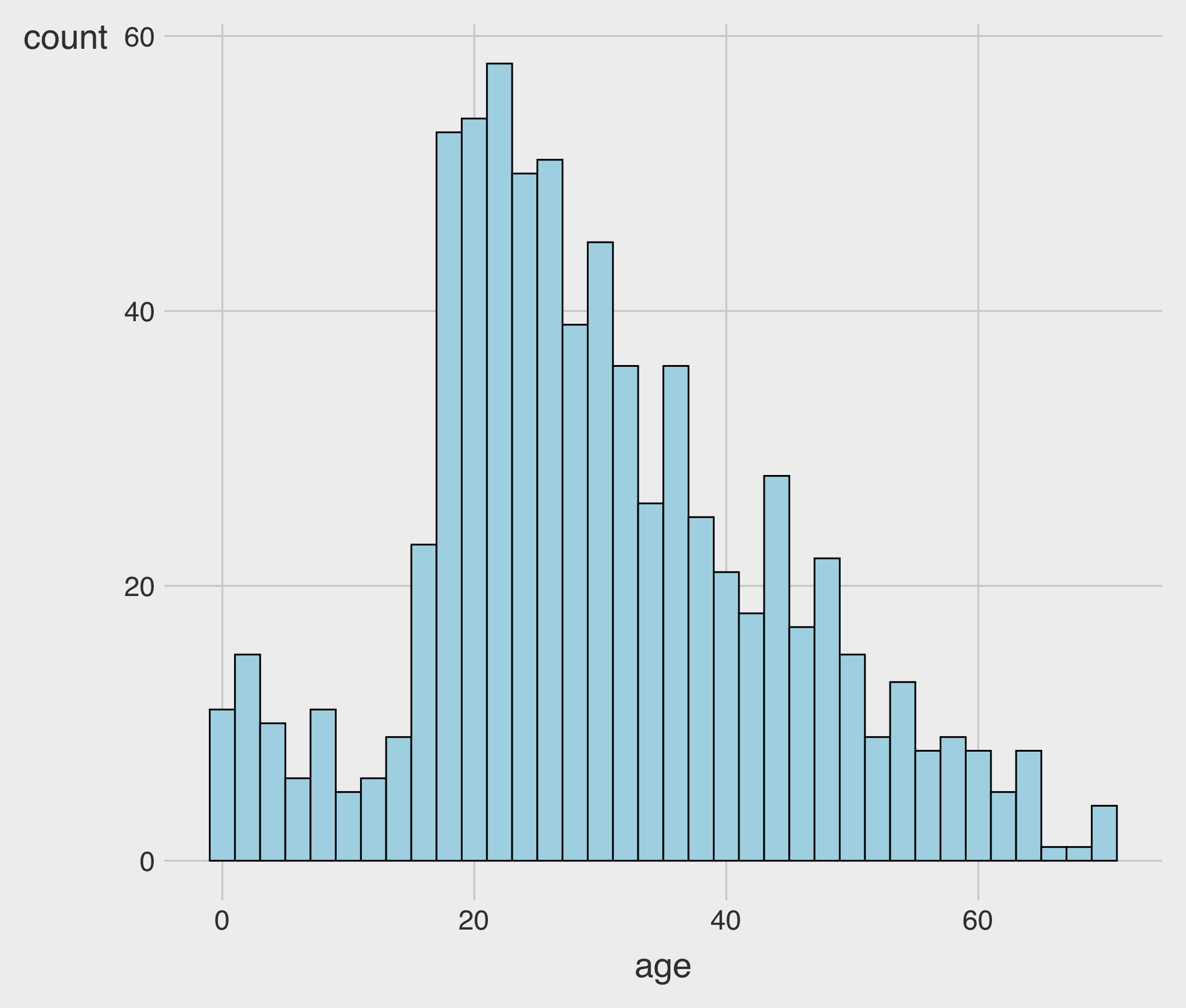 x aesthetic to a variable.geom_histogram() with binsbins: Specifies the number of binsgeom_histogram() with binwidthbinwidth: Specifies the width of each binbins option or the binwidth option.color and fill Aesthetics