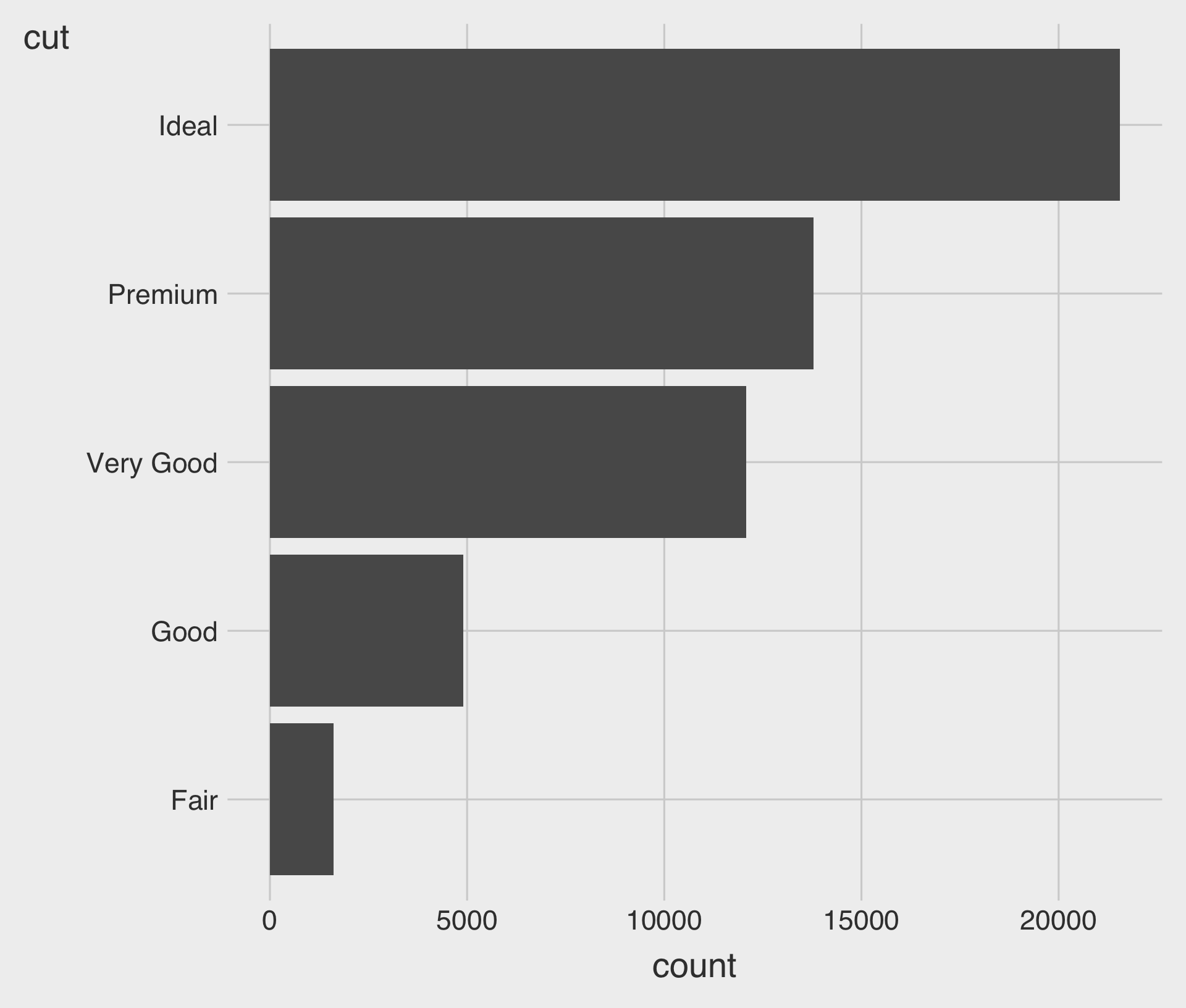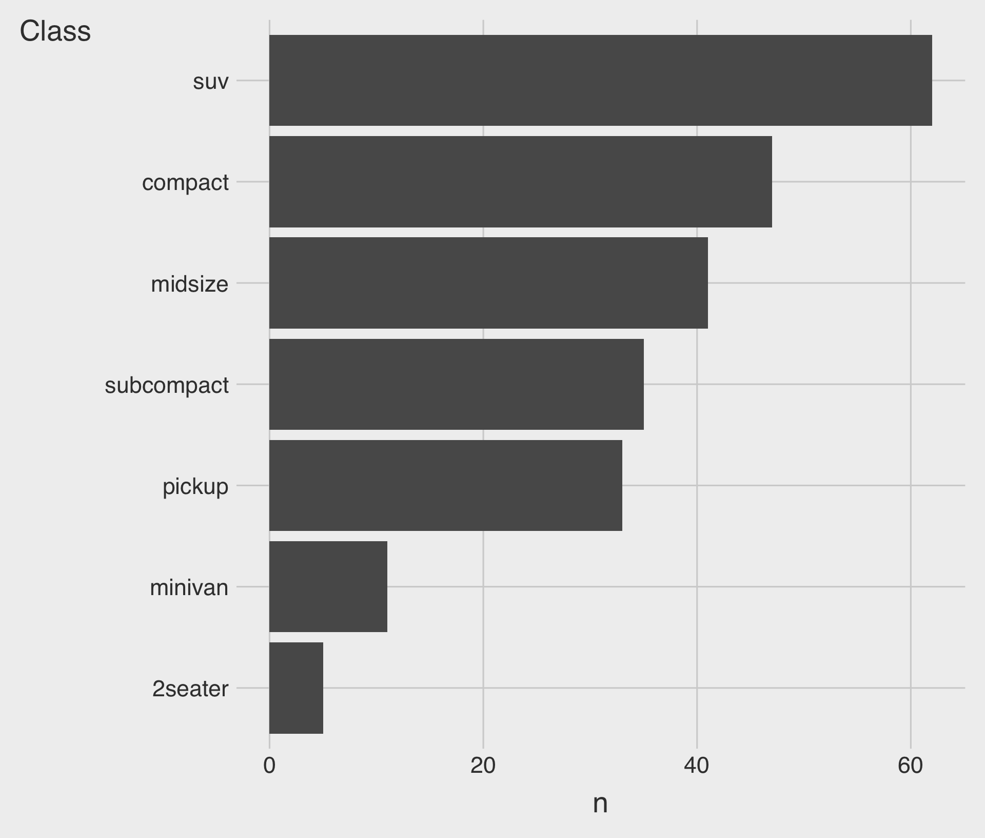 fct_reorder(CATEGORICAL, NUMERICAL): Reorders the categories of the CATEGORICAL by the median of the NUMERICAL.ggplot() - Bar ChartsBar charts are used to visualize the distribution of a categorical variable.