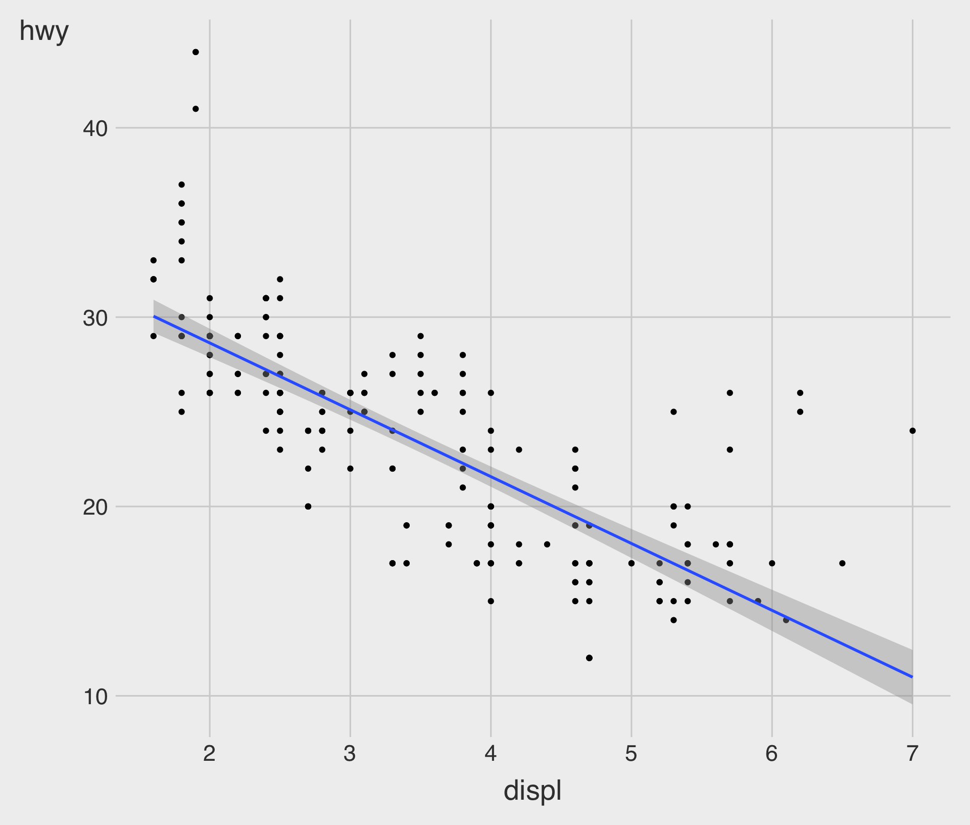 x and y variables falls within the grey ribbon.geom_point() with geom_smooth(method = lm)method = "lm" specifies that a linear model (lm), called a linear regression model.ggplot()mpg data.frame?Many points overlap each other.