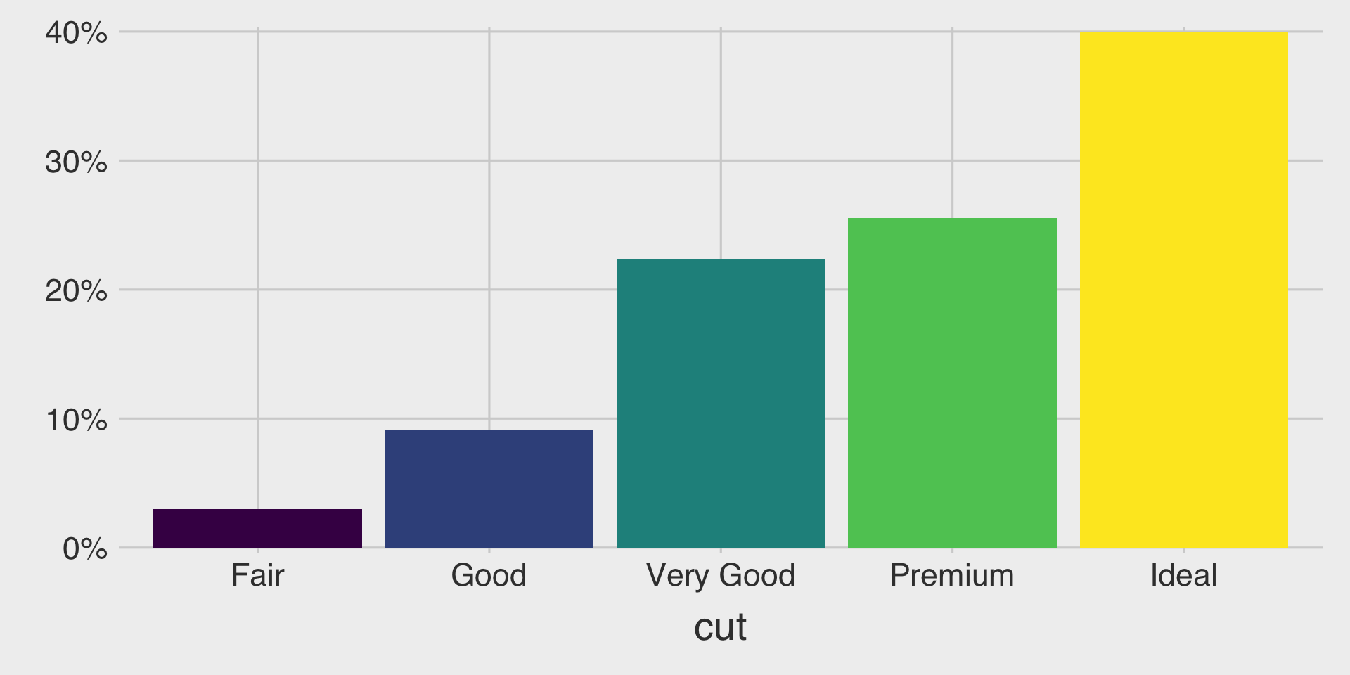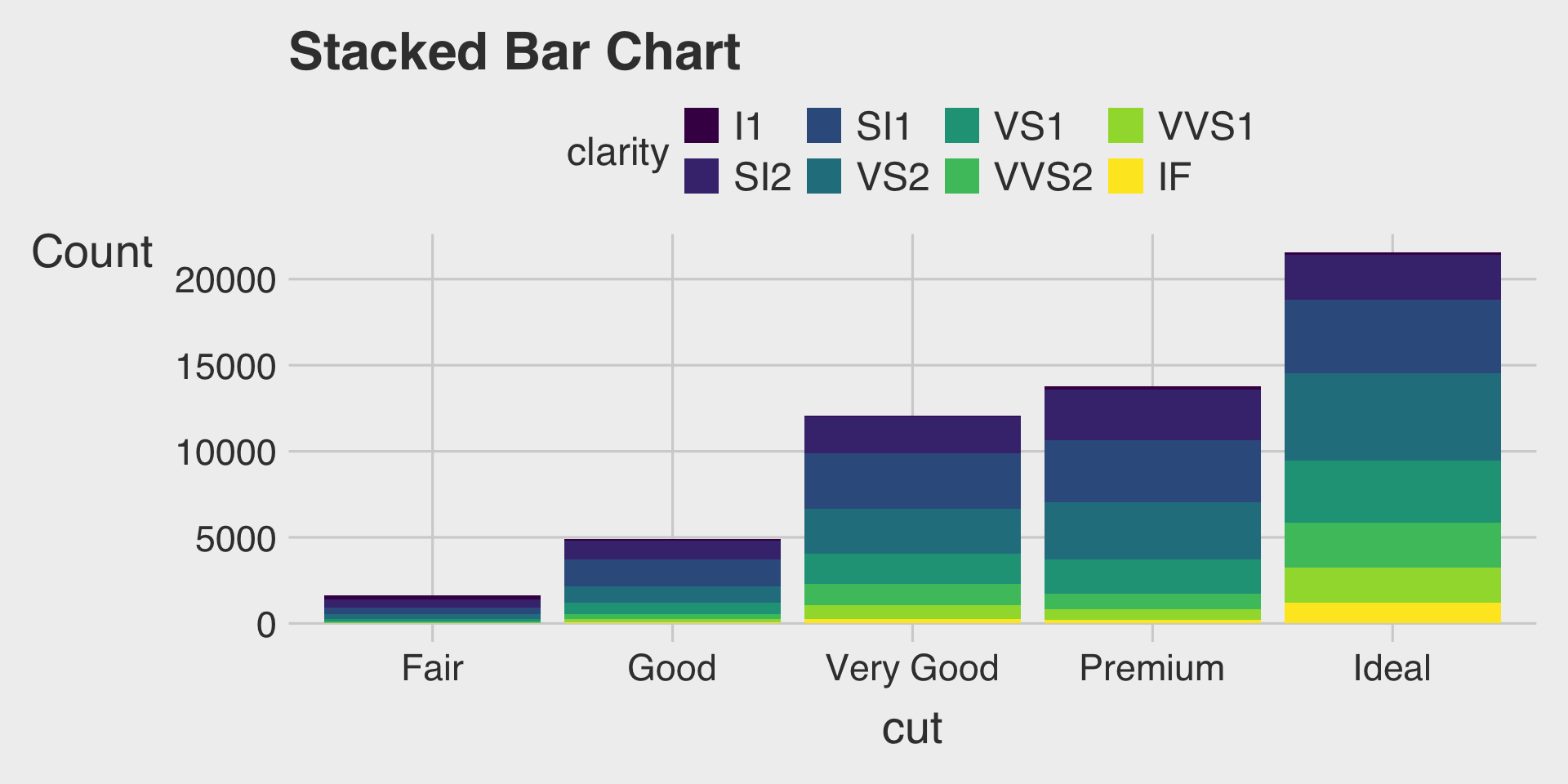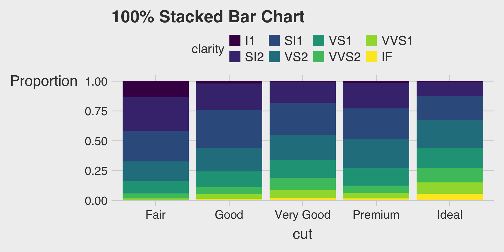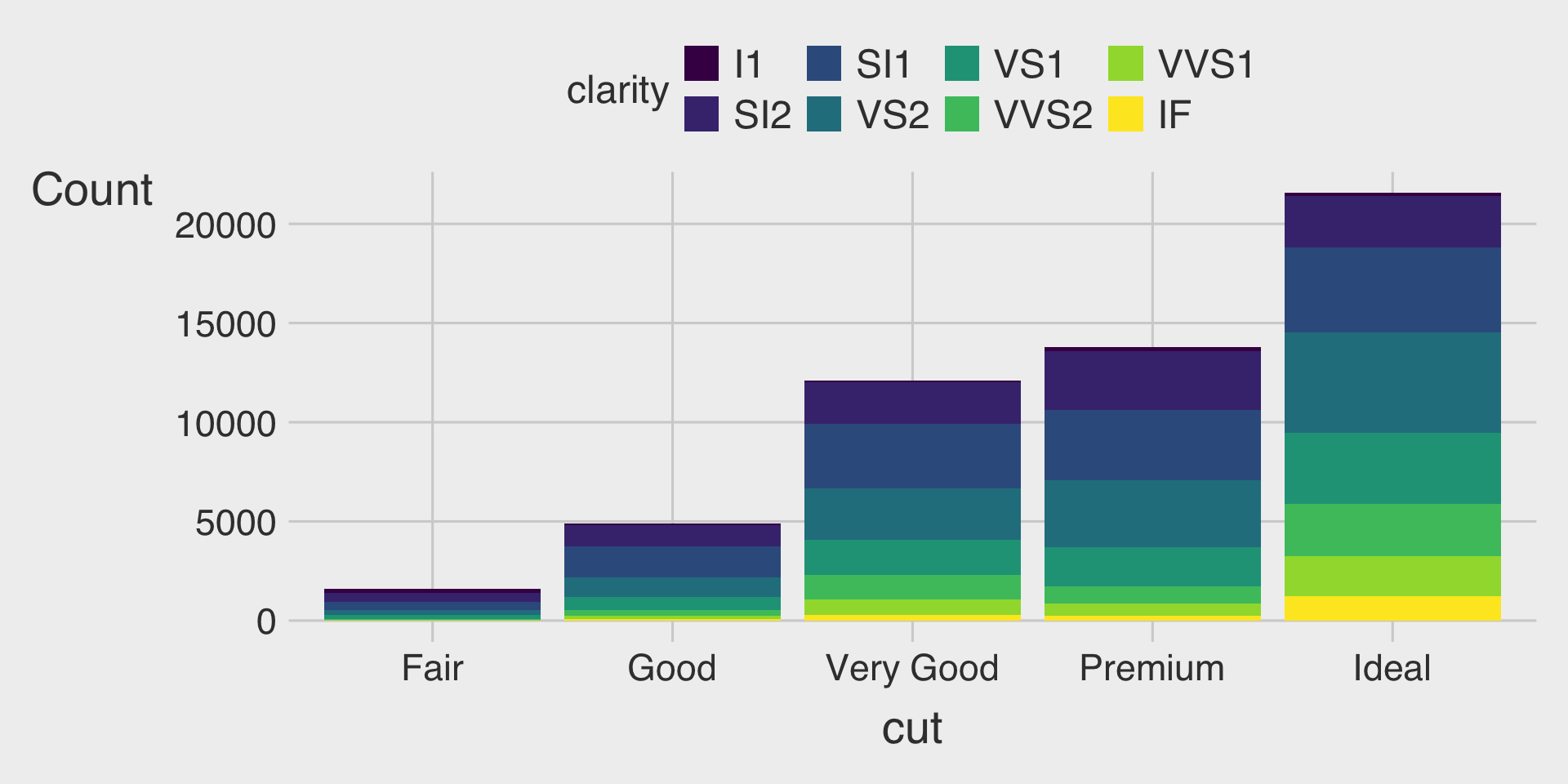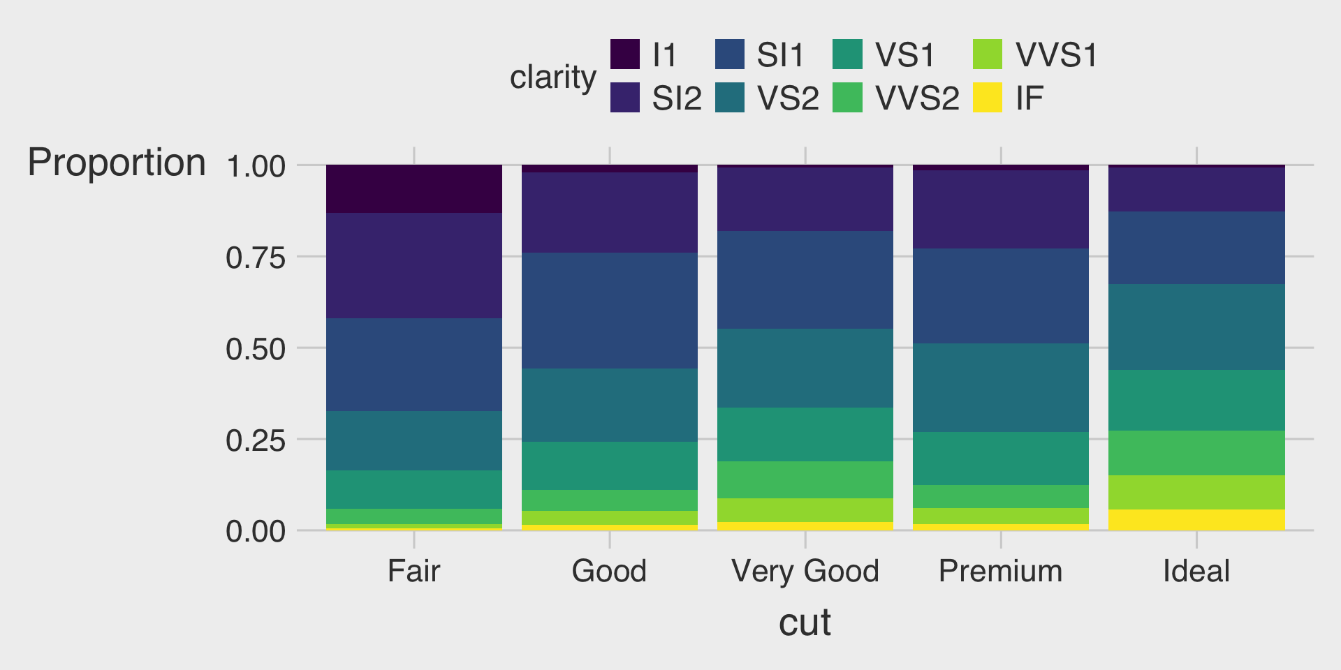 clarity varies by cut, with total bar height for overall count and segments for each clarity level.fill Aesthetic & the position="fill"