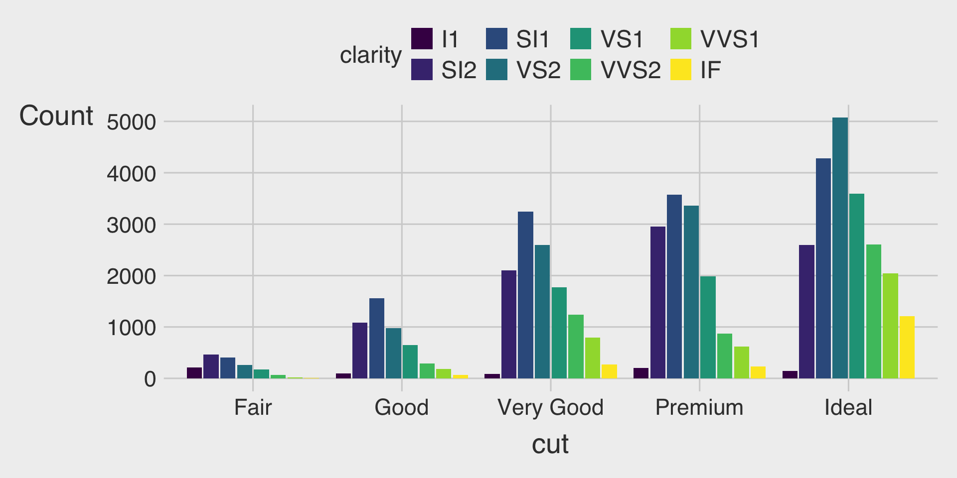 fill Aestheticfill aesthetic.count(): Counting Occurrences Across Two Categorical Variablescount() calculates the frequency of each unique combination of values across two categorical variables.diamonds |> count(cut, clarity) returns the data.frame with the three variables, cut, clarity, and n: