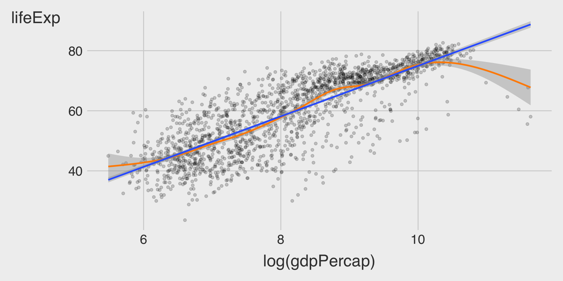 geom_smooth(method = "lm")(2) log(gdpPercap) vs. lifeExp