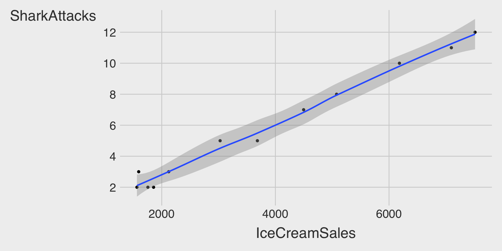 scale_y_continuous(breaks = seq(2, 7, 1)*10^3) The observed relationship is correlation, not causation. While the data shows that higher ice cream sales are associated with more drowning incidents, this does not imply that buying more ice cream causes more drownings.