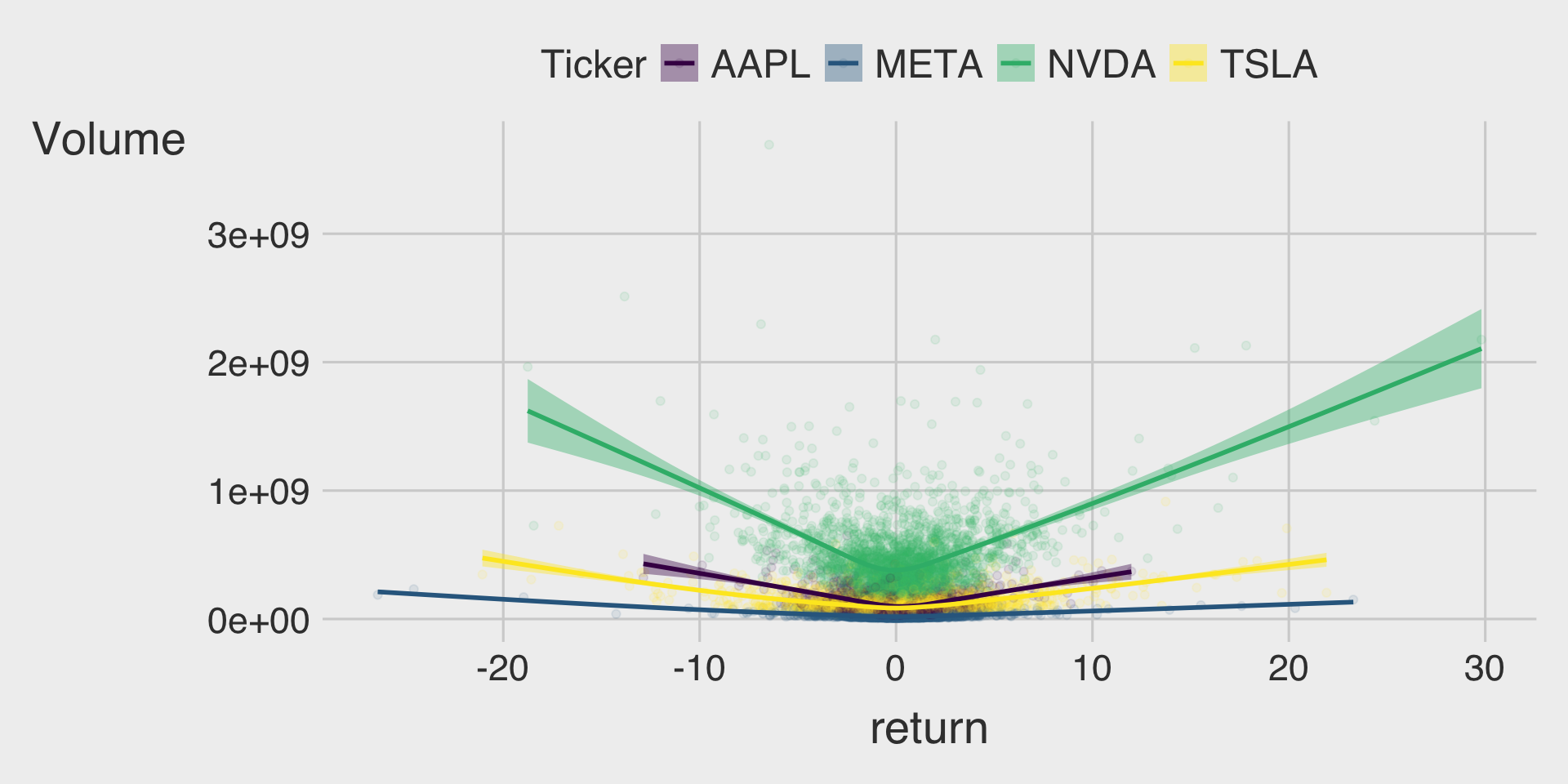 Provide a ggplot showing the relationship between daily stock return and daily trading volume (Volume) for each company (Ticker), and write a brief comment describing any visible pattern (e.g., positive/negative association, strength, outliers, and whether it differs across tickers).
