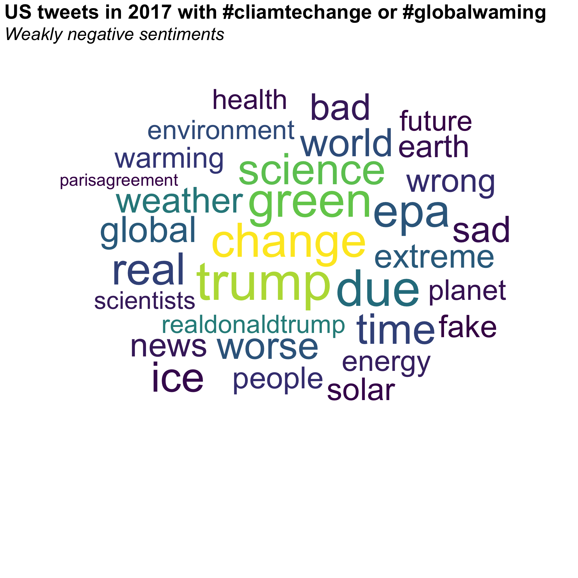 x_words <- x_cc_neg_weak |>mutate(content =str_remove_all(content, "<[^>]+>"), # remove HTML tagscontent =str_remove_all(content, "http[s]?://\\S+"), # remove URLscontent =str_squish(content) # trim ends and collapse repeated whitespace into single spaces ) |>unnest_tokens(word, content) |>anti_join(stop_words, by ="word") |>filter(str_detect(word, "^[a-z]+$") # keep only pure alphabetic words ) |>count(word, sort =TRUE) |>filter(!(word %in%c("climatechange", "globalwarming","rt", "climate"))) |>filter(dense_rank(-n) <=30)x_words |>ggplot(aes(label = word, size = n,color = n)) +geom_text_wordcloud_area() +scale_size_area(max_size =50)+scale_color_viridis_c(option ="D") +theme_minimal() +theme(panel.grid =element_blank(),plot.title =element_text(size =rel(2.25),face ='bold' ),plot.subtitle =element_text(size =rel(2),face ='italic',margin =margin(b =-160) ) ) +labs(title ="US tweets in 2017 with #cliamtechange or #globalwaming",subtitle ="Weakly negative sentiments")