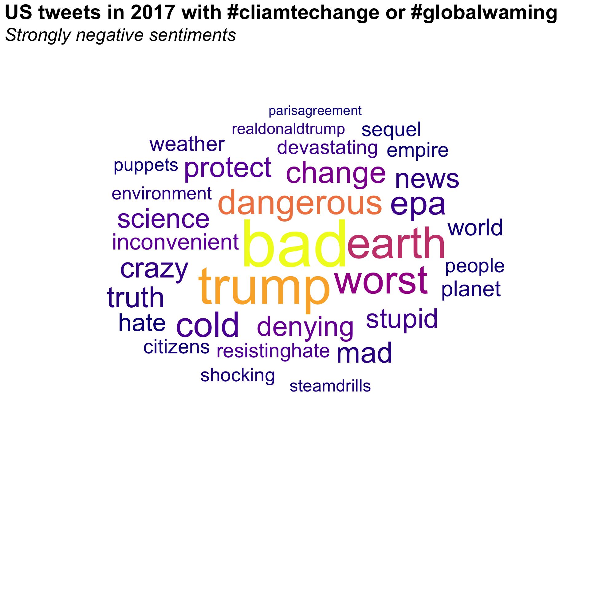 x_words <- x_cc_neg_strong |>mutate(content =str_remove_all(content, "<[^>]+>"), # remove HTML tagscontent =str_remove_all(content, "http[s]?://\\S+"), # remove URLscontent =str_squish(content) # trim ends and collapse repeated whitespace into single spaces ) |>unnest_tokens(word, content) |>anti_join(stop_words, by ="word") |>filter(str_detect(word, "^[a-z]+$") # keep only pure alphabetic words ) |>count(word, sort =TRUE) |>filter(!(word %in%c("climatechange", "globalwarming","rt", "climate"))) |>filter(dense_rank(-n) <=30)x_words |>ggplot(aes(label = word, size = n,color = n)) +geom_text_wordcloud_area() +scale_size_area(max_size =50) +scale_color_viridis_c(option ="C") +theme_minimal() +theme(panel.grid =element_blank(),plot.title =element_text(size =rel(2.25),face ='bold' ),plot.subtitle =element_text(size =rel(2),face ='italic',margin =margin(b =-160) ) ) +labs(title ="US tweets in 2017 with #cliamtechange or #globalwaming",subtitle ="Strongly negative sentiments")