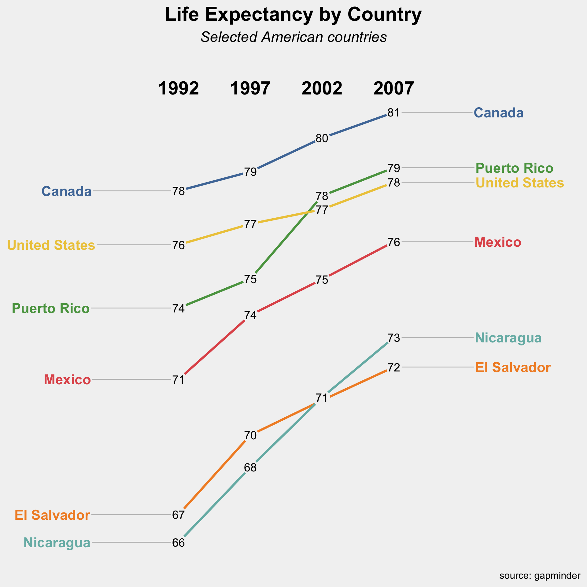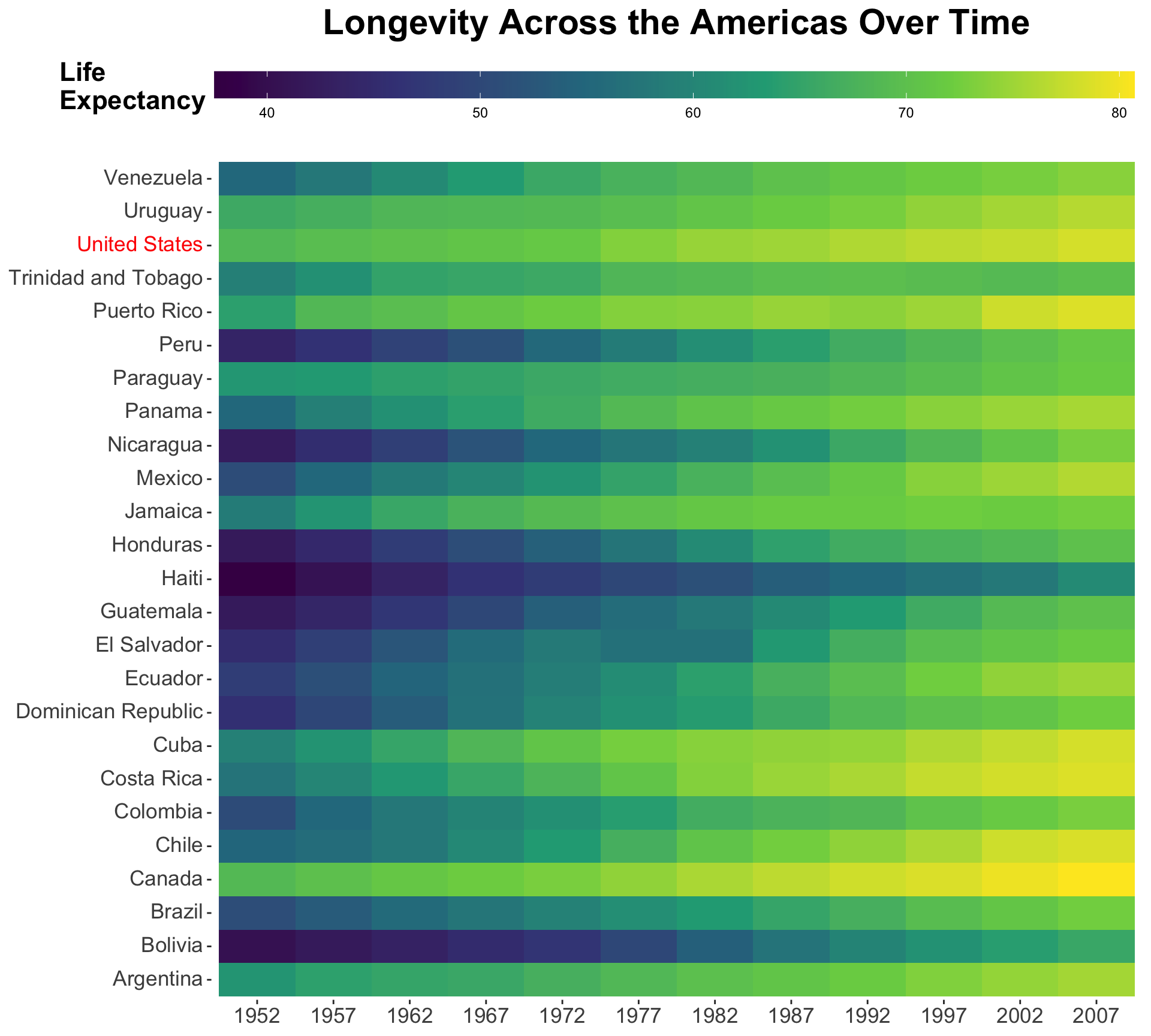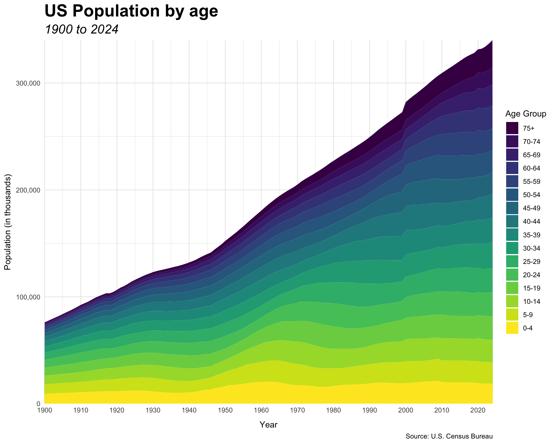 pop2 <- pop |>filter(age_group !="all", sex =="both") |>mutate(age_group =factor(age_group,levels =c("0-4", "5-9", "10-14", "15-19", "20-24", "25-29", "30-34", "35-39", "40-44", "45-49", "50-54", "55-59", "60-64", "65-69", "70-74", "75+") ),age_group =fct_rev(age_group))pop2 |>ggplot(aes(x = year,y = population/1000, fill = age_group)) +geom_area(color =NA) +labs(title ="US Population by age",subtitle ="1900 to 2024",caption ="Source: U.S. Census Bureau",x ="Year",y ="Population (in thousands)",fill ="Age Group") +scale_fill_viridis_d() +scale_y_comma(expand =c(0,0)) +scale_x_continuous(breaks =seq(1900,2020, 10),expand =c(0,0)) +theme_minimal() +theme(axis.title.x =element_text(margin =margin(t =10)),axis.title.y =element_text(margin =margin(r =5)),plot.title =element_text(size =rel(2),face ="bold"),plot.subtitle =element_text(size =rel(1.5),face ="italic") )