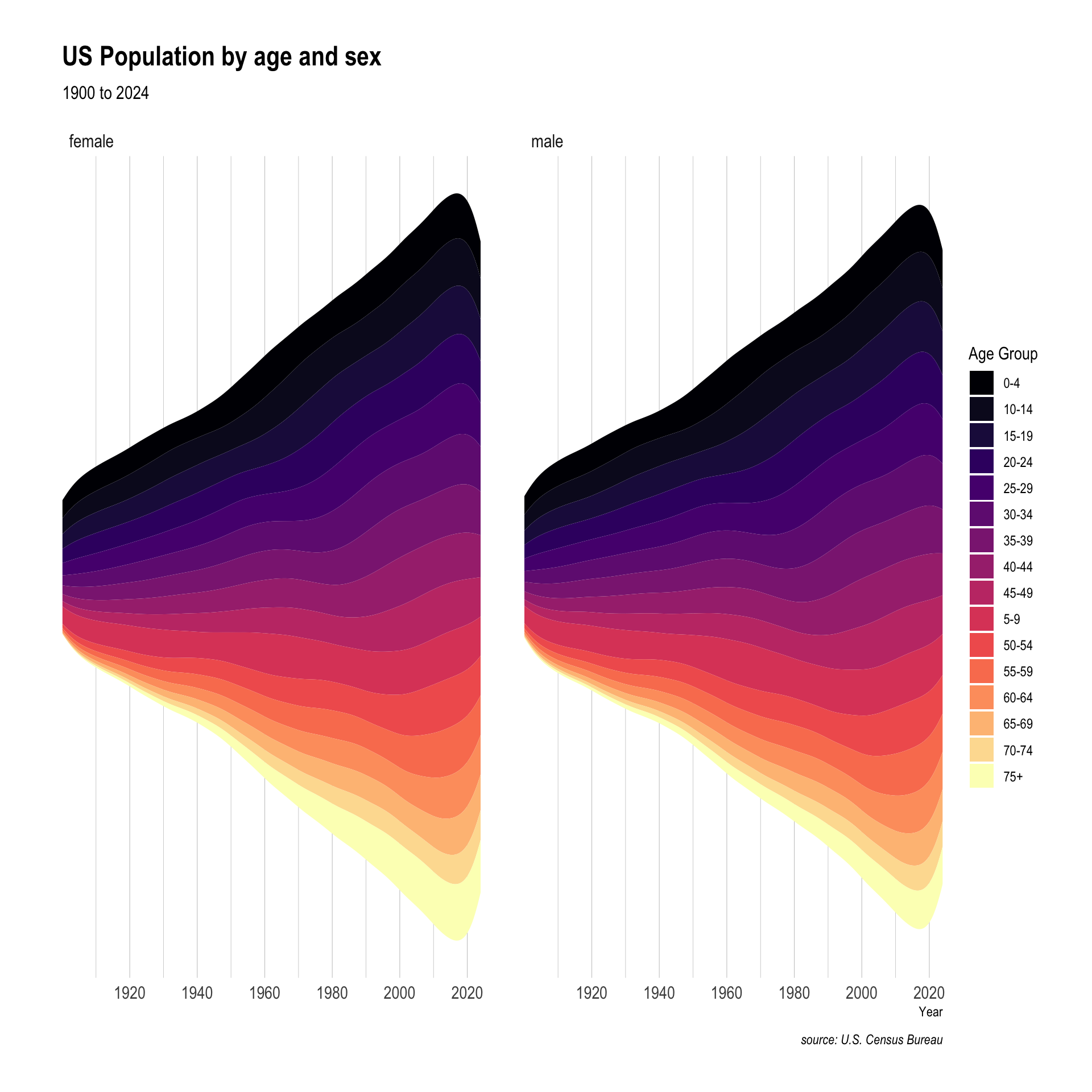 pop |>filter(age_group !="all", sex !="both") |>ggplot(aes(x = year,y = population, fill = age_group)) +geom_stream() +facet_wrap(~sex) +labs(title ="US Population by age and sex",subtitle ="1900 to 2024",caption ="source: U.S. Census Bureau",x ="Year",y ="",fill ="Age Group") +scale_fill_viridis_d(option ="magma") +scale_x_continuous(breaks =seq(1900,2020, 20),expand =c(0,0)) +theme_ipsum() +theme(panel.grid.major.y =element_blank(),panel.grid.minor.y =element_blank(),axis.text.y =element_blank())