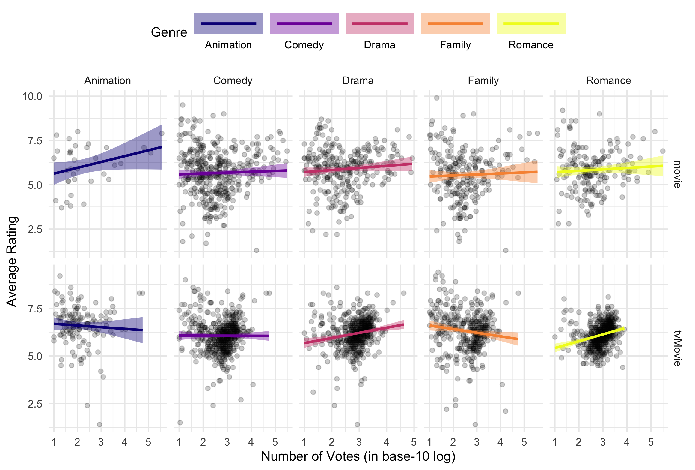 - For TV/Movies, the relationship is generally clearer and more positive in Drama and Romance (ratings tend to rise as vote counts increase), while Family shows a negative slope (more-voted titles tend to have slightly lower ratings). Animation is roughly flat to slightly negative, and Comedy is close to flat.