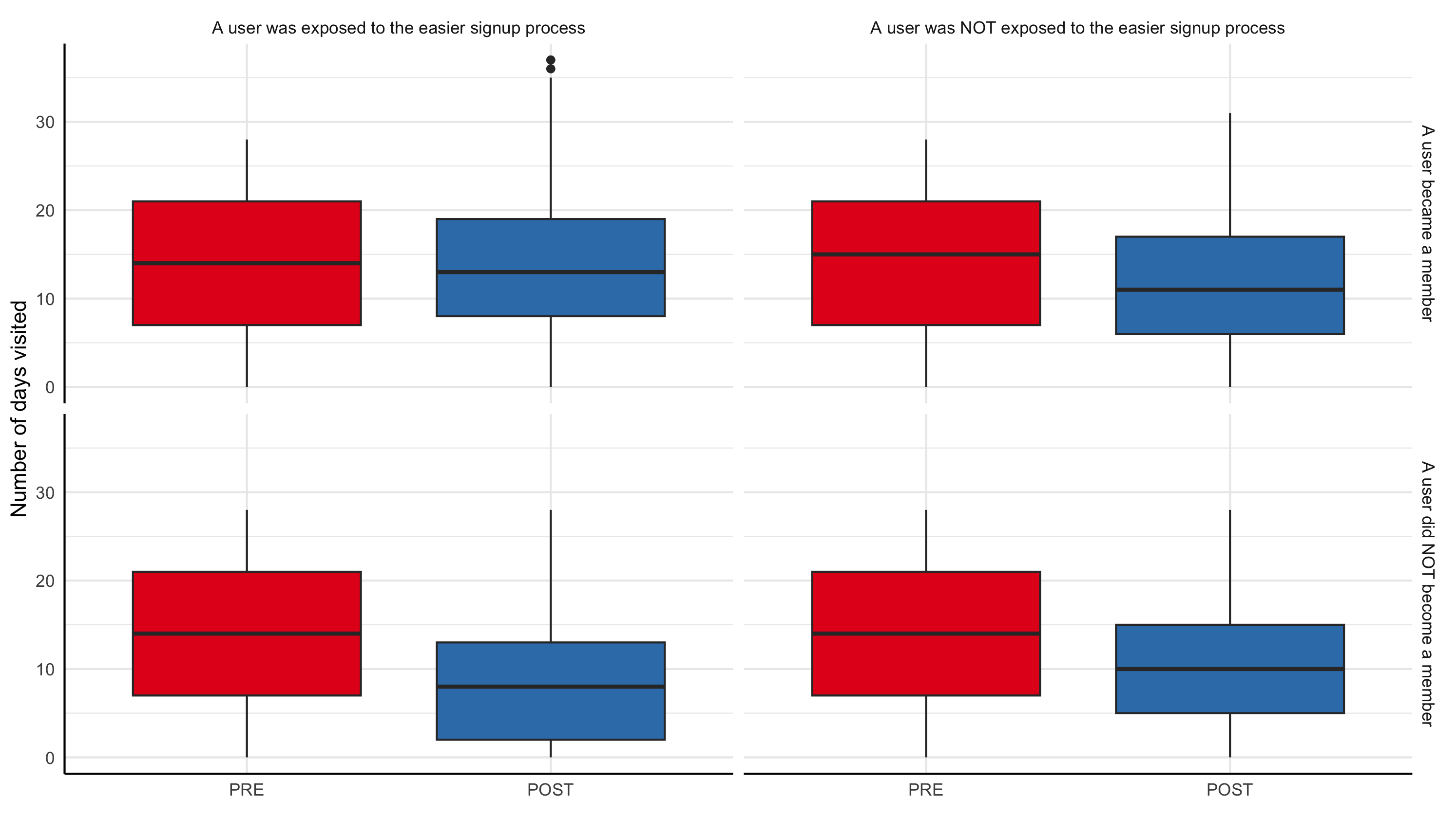 - For users who became members, days_visited stays roughly similar from PRE to POST, regardless of whether they were exposed to the easier signup process.