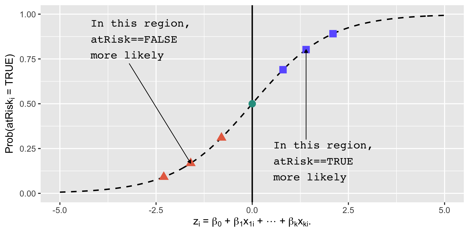 The function \(G(z_i)\) is called the logistic function because the function \(G(z_i)\) is the inverse function of a logit (or a log-odd) of the probability that the outcome \(y_{i}\) is 1. \[ \begin{align} G^{-1}(z_i) &\,\equiv\, \text{logit} (\text{Prob}(y_{i} = 1))\\ &\,\equiv \log\left(\, \frac{\text{Prob}(y_{i} = 1)}{\text{Prob}(y_{i} = 0)} \,\right)\\ &\,=\, b_0 + b_{1}x_{1,i} + b_{2}x_{2,i} + \,\cdots\, + b_{k}x_{k,i} \end{align} \]