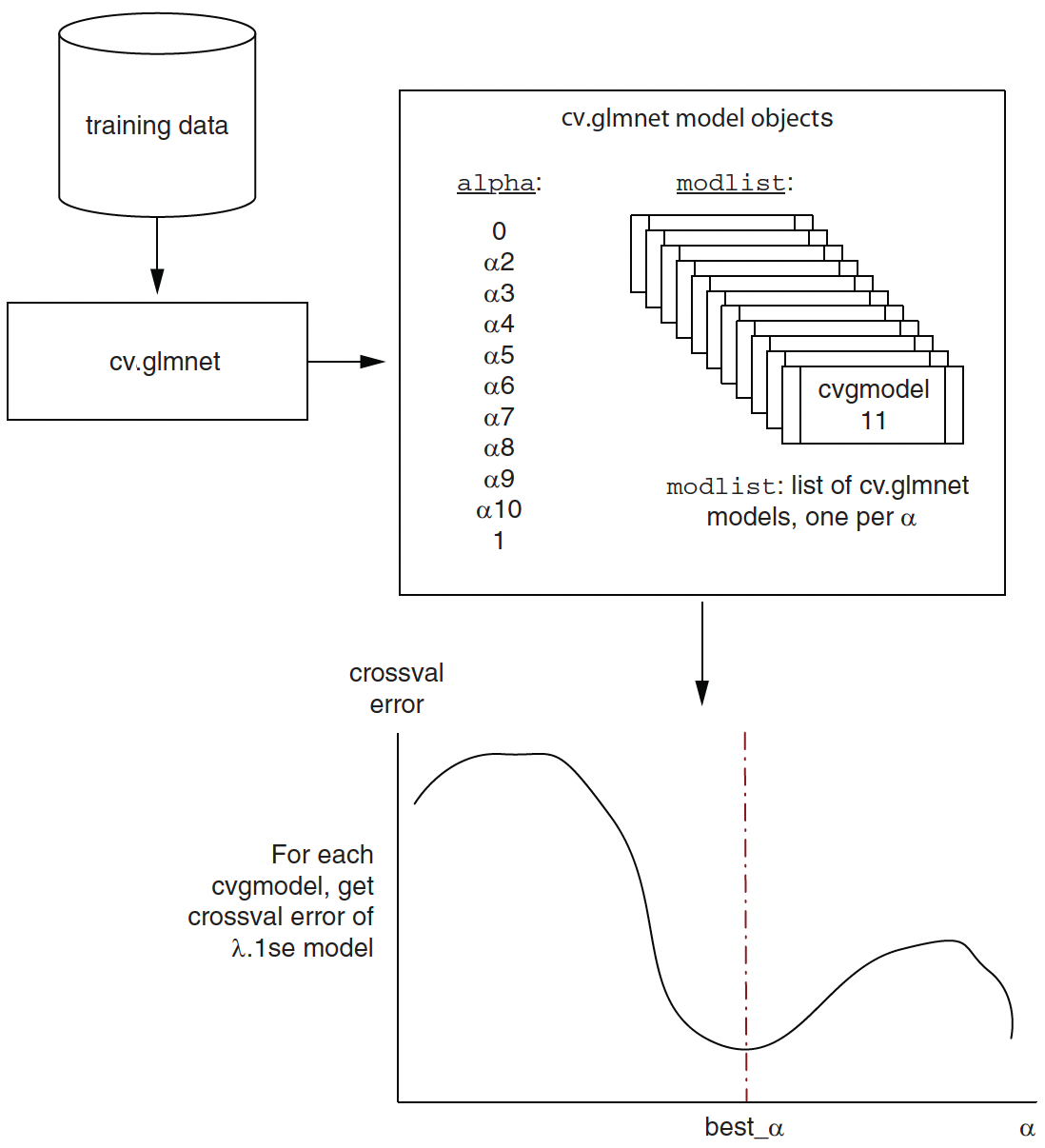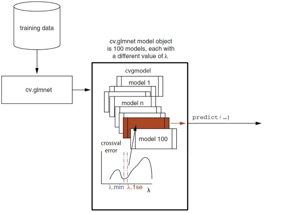 Elastic net regression tries to find the beta parameters \(\beta_0, \beta_1, \beta_2, \,\cdots\, \beta_{p}\), \(\alpha\), and \(\lambda\) such that \[ f(x_i) = b_0 + b_1 x_{1,i} + b_2 x_{2,i} + \,\cdots\, + b_p x_{p,i} \] is as close as possible to \(y_i\) for all the training data by minimizing the sum of the squared error (SSE) plus a linear combination of the ridge and the lasso penalties with the \(\alpha\) parameter: \[ \begin{align} &(y_1 - f(x_1))^2 + (y_2 - f(x_2))^2 + \,\cdots\, + (y_N - f(x_N))^2 \\ &+ \alpha \times \lambda \times(| \beta_1 | + |\beta_2 | + \,\cdots\, + |\beta_{p}|)\\ &+ (1-\alpha)\times \lambda \times(\beta_1^2 + \beta_2^2 + \,\cdots\, + \beta_{p}^2) \end{align} \] where \(0 \leq \alpha \leq 1\).
