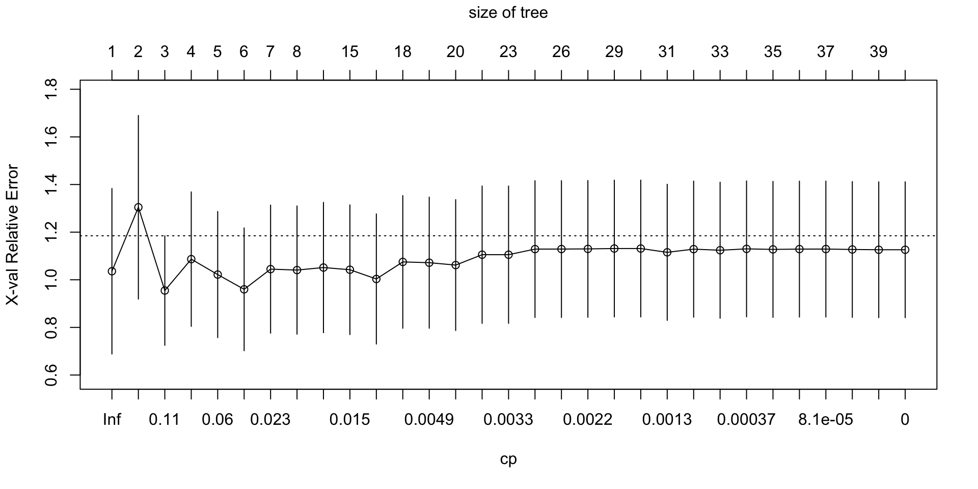 plotcp()visualizes the cost-complexity pruning results stored in the fittedrpartobject.The horizontal axis shows the size of the tree, often in terms of the number of splits.