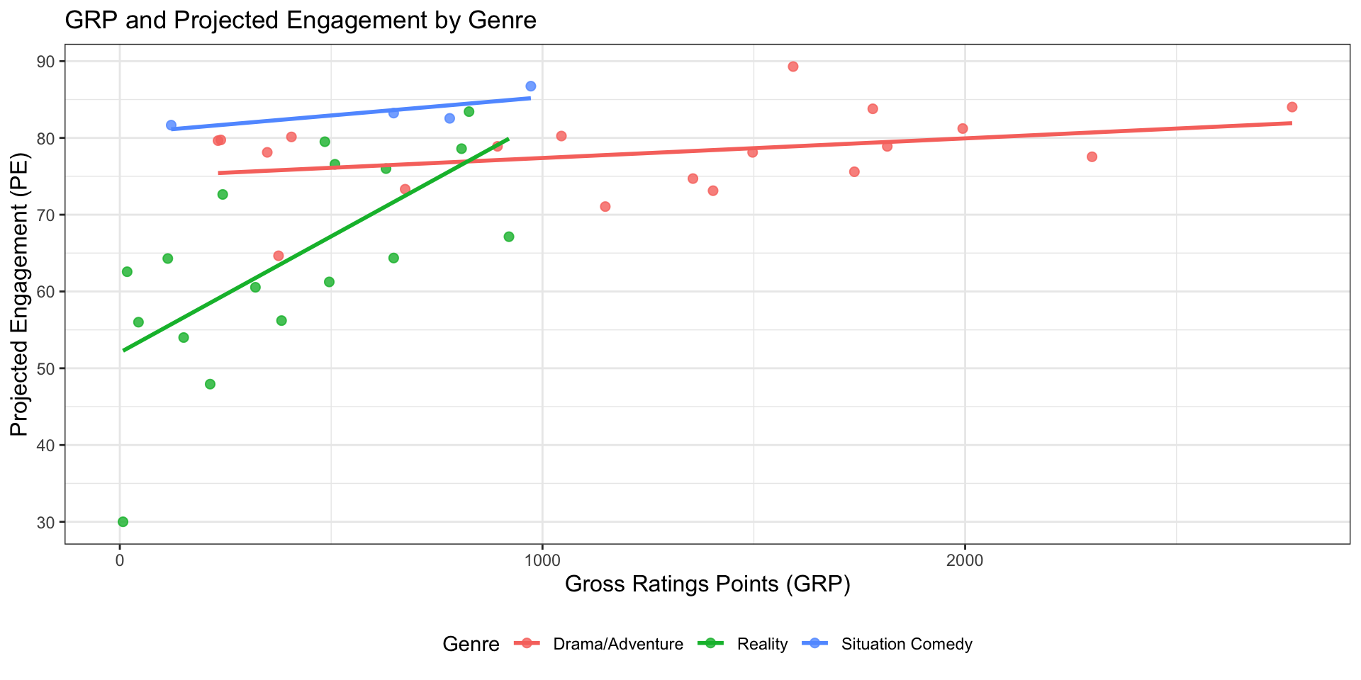 paged_table(nbc_demog)Visualize GRP and PE by genre