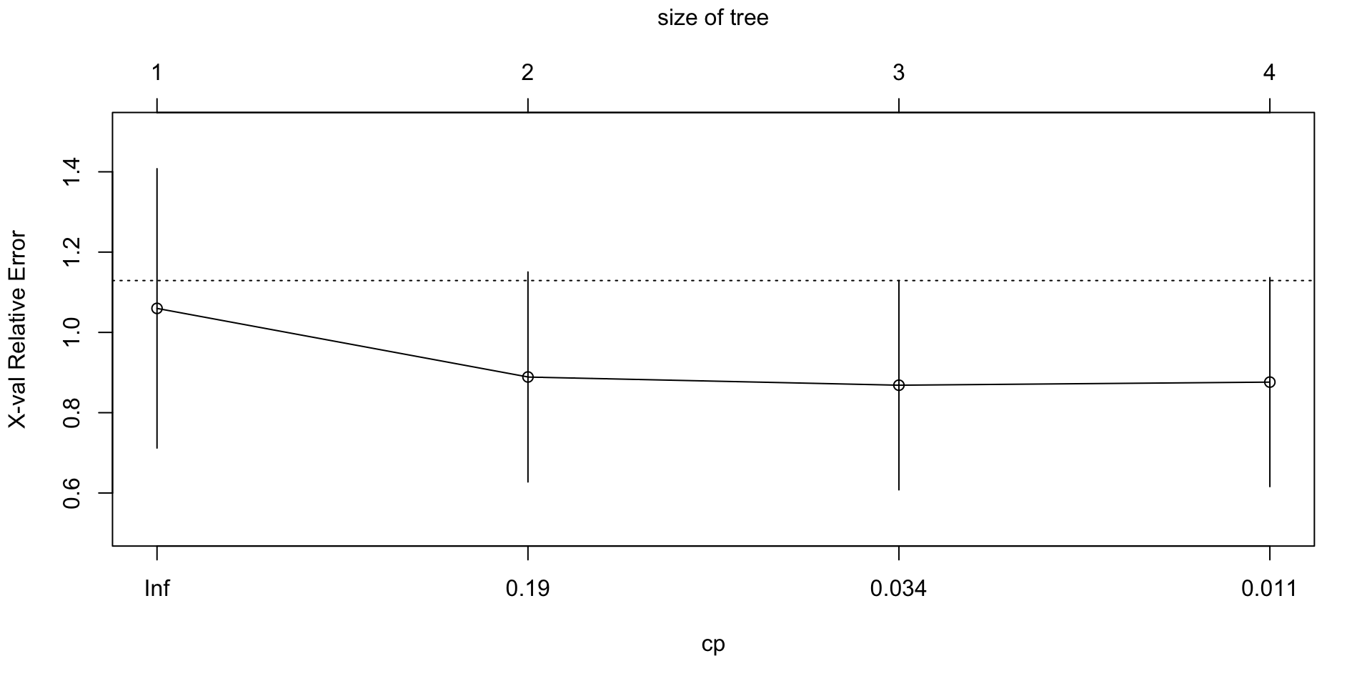xerrorindicate better estimated out-of-sample performance.Each point represents a candidate pruning level, indexed by the complexity parameter