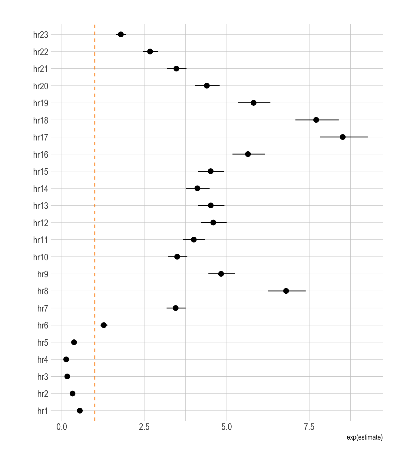 geom_vline(xintercept = 1, color = "darkorange", linetype = 2) +