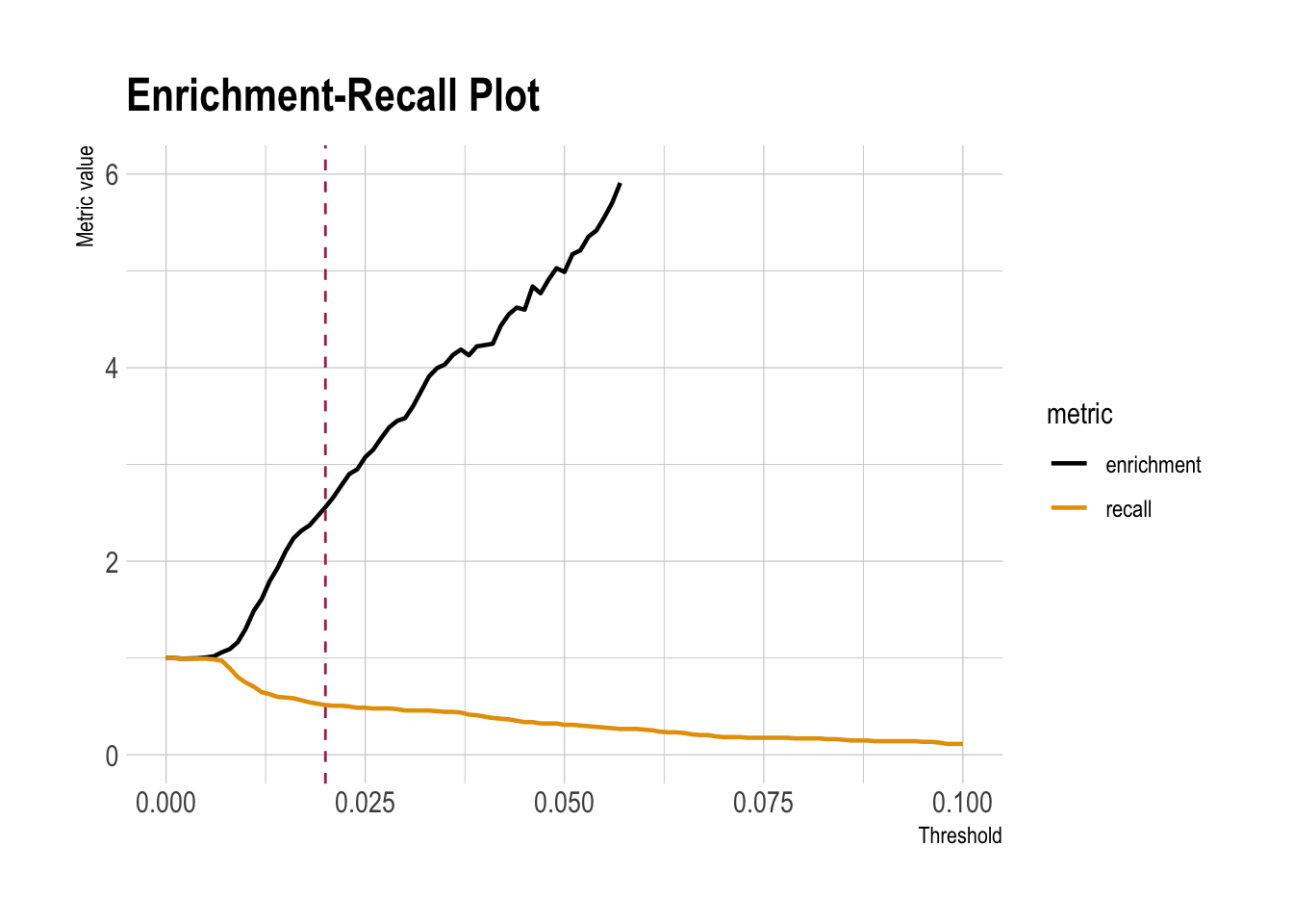 filter(metric %in% c("enrichment", "recall")) |>