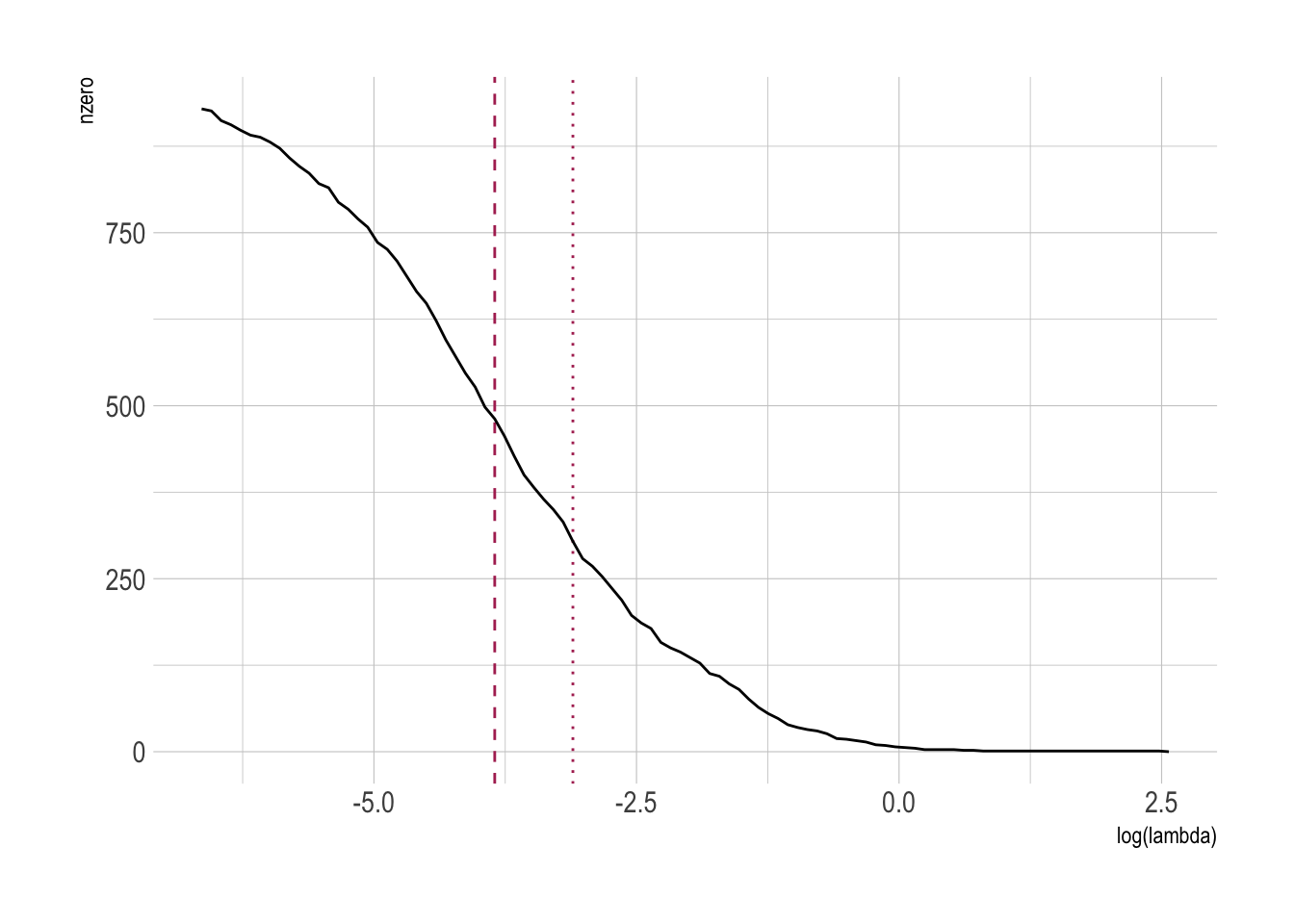 abline(v = log(model_lasso$lambda.1se), lty = 3)