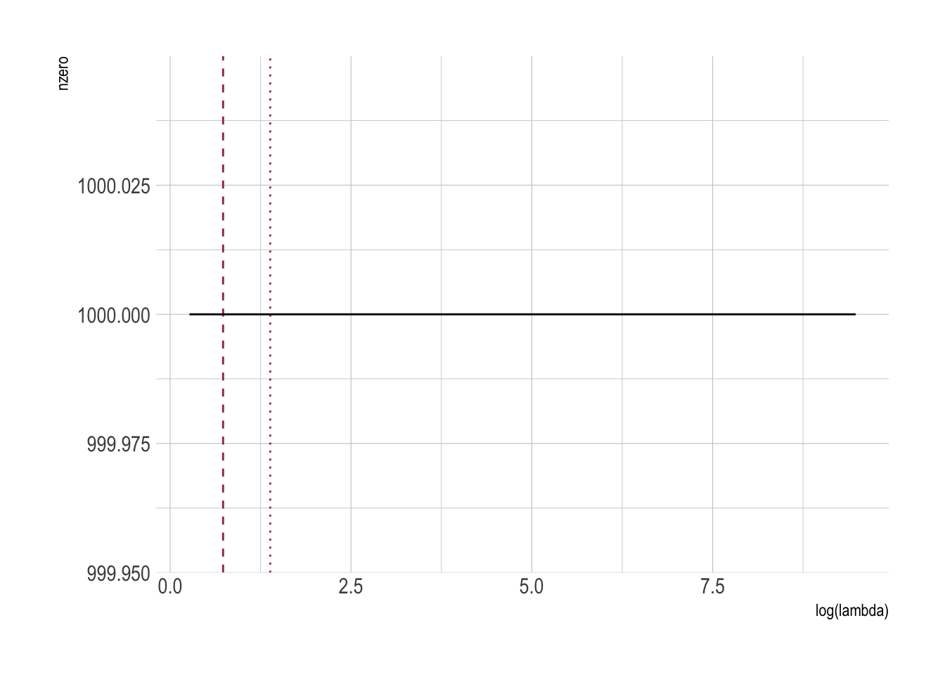 abline(v = log(model_ridge$lambda.1se), lty = 3)