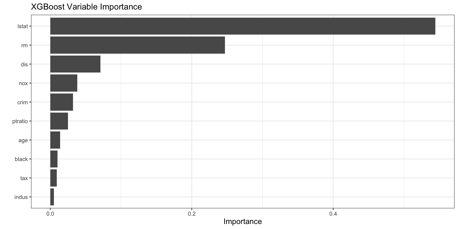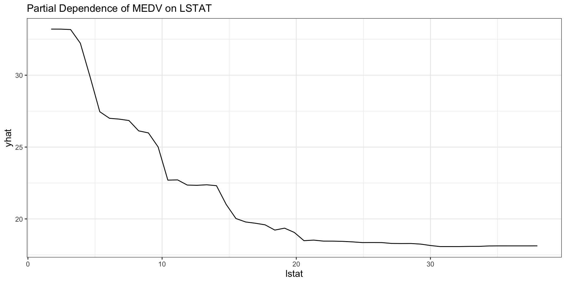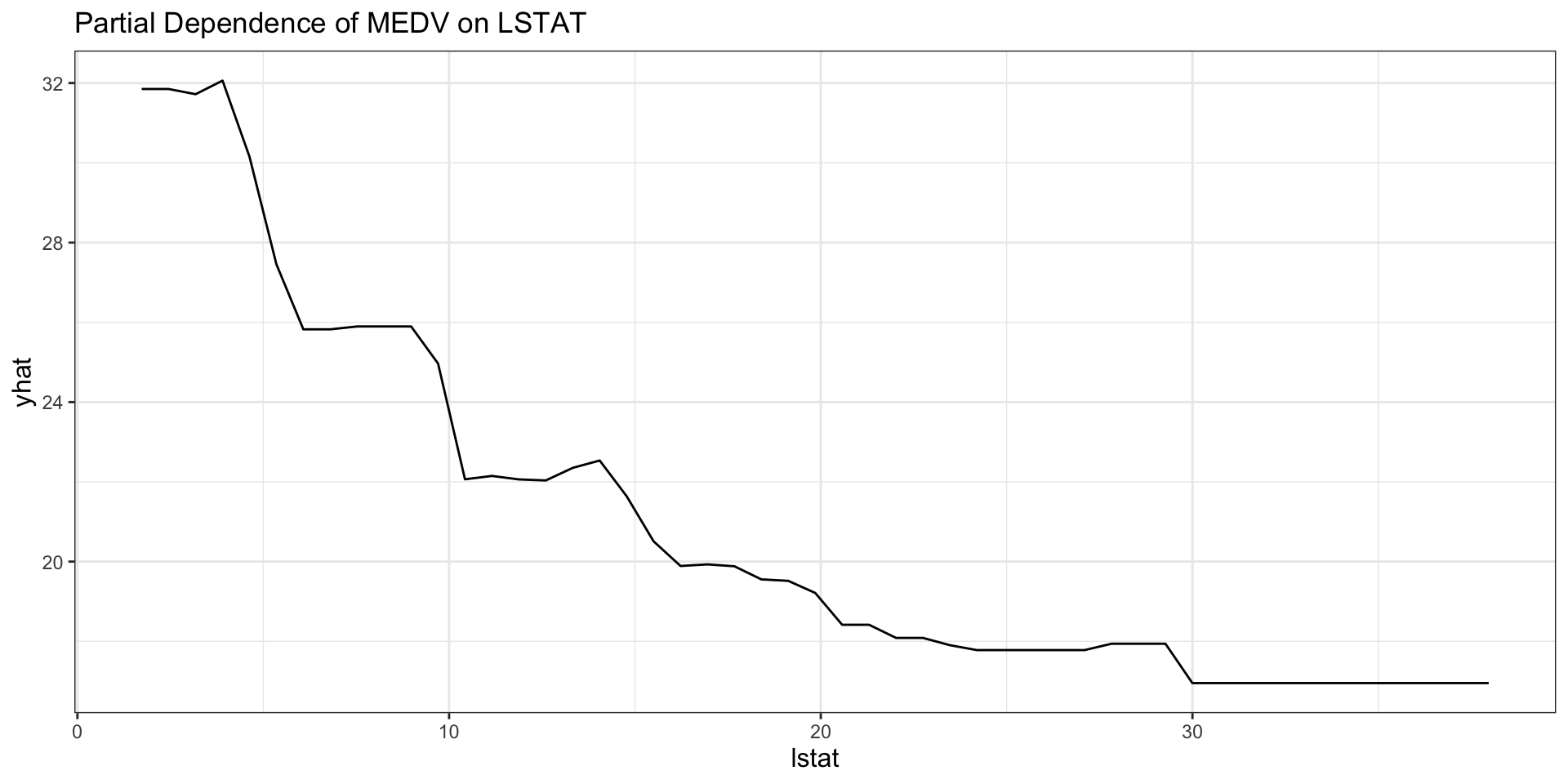 lstatand predicted housing values. - Because XGBoost is highly flexible, the curve can show richer nonlinearities than a single tree.