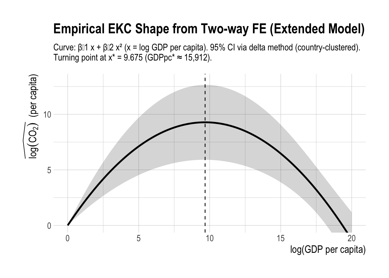 # EKC shape + 95% band (country-clustered), plotted over x in [0, 20], y in [0, 13]# 0) Cluster-robust vcovV <-vcovHC(m3_twfe_ext, type ="HC1", cluster ="group")# 1) Coefs (GDP terms only)b <-coef(m3_twfe_ext)b1 <-unname(b["log_gdppc"])b2 <-unname(b["log_gdppc2"])# 2) Grid over requested rangeekc_shape_df <-tibble(x =seq(0, 20, length.out =400)) |>mutate(ekc_shape = b1 * x + b2 * x^2)# 3) Delta-method SE for m(x) = b1*x + b2*x^2V_sub <- V[c("log_gdppc", "log_gdppc2"), c("log_gdppc", "log_gdppc2")]ekc_shape_df <- ekc_shape_df |>rowwise() |>mutate(se =sqrt(c(x, x^2) %*% V_sub %*%c(x, x^2)),lo = ekc_shape -1.96* se,hi = ekc_shape +1.96* se ) |>ungroup()# 4) Turning pointx_star <--b1 / (2* b2)gdppc_star <-exp(x_star)# 5) Plotggplot(ekc_shape_df, aes(x = x, y = ekc_shape)) +geom_ribbon(aes(ymin = lo, ymax = hi), alpha =0.2) +geom_line(linewidth =1.1) +geom_vline(xintercept = x_star, linetype ="dashed") +coord_cartesian(xlim =c(0, 20), ylim =c(0, 13)) +labs(title ="Empirical EKC Shape from Two-way FE (Extended Model)",subtitle =paste0("Curve: Ξ²Μ1 x + Ξ²Μ2 xΒ² (x = log GDP per capita). ","95% CI via delta method (country-clustered). ","\nTurning point at x* = ", round(x_star, 3)," (GDPpc* β ", scales::comma(round(gdppc_star, 0)), ")." ),x ="log(GDP per capita)",y =expression(widehat(log(CO[2]))~~"(per capita)") )