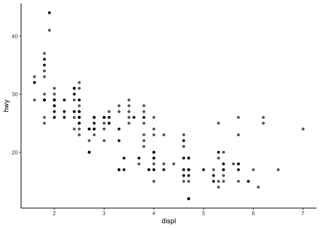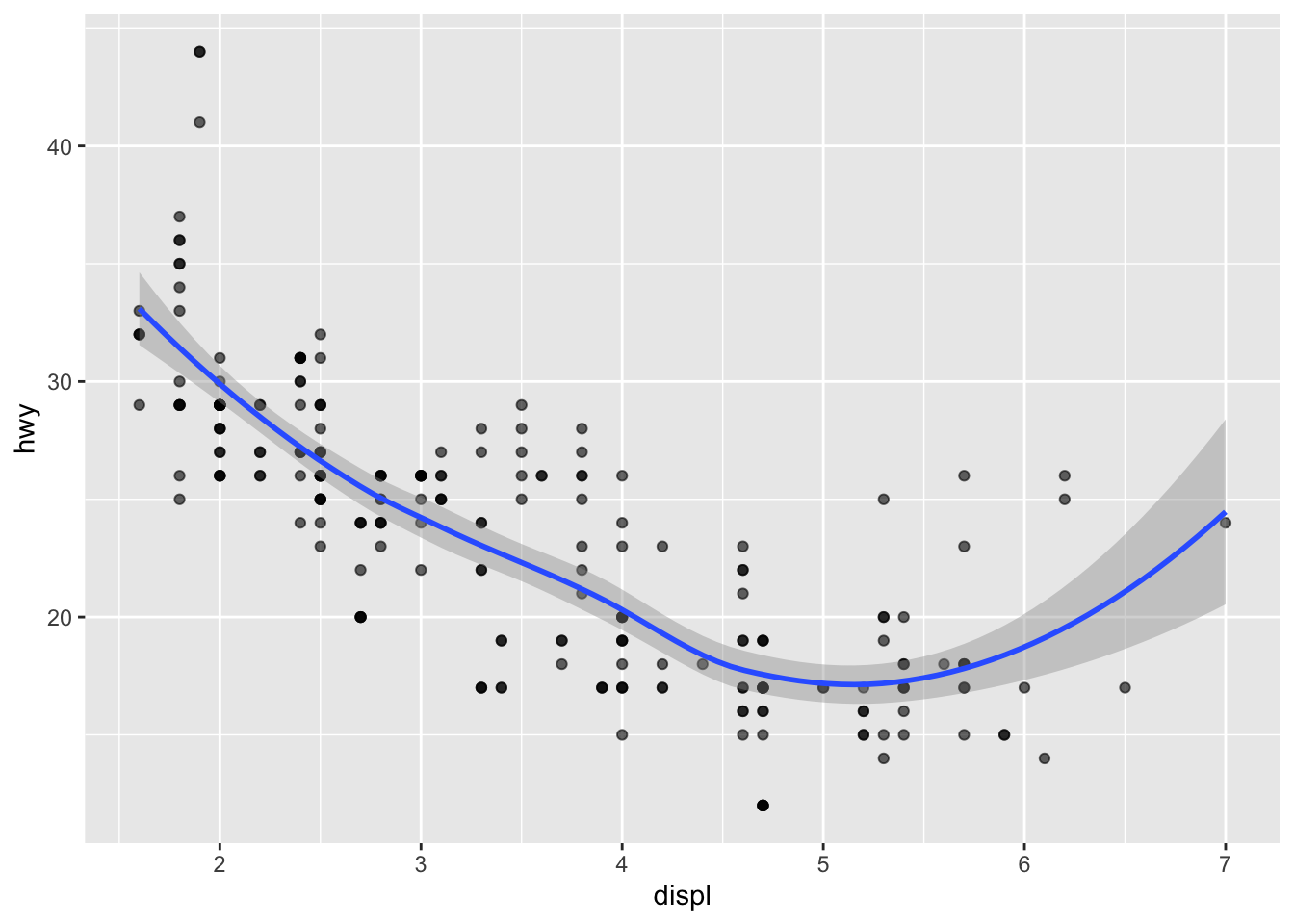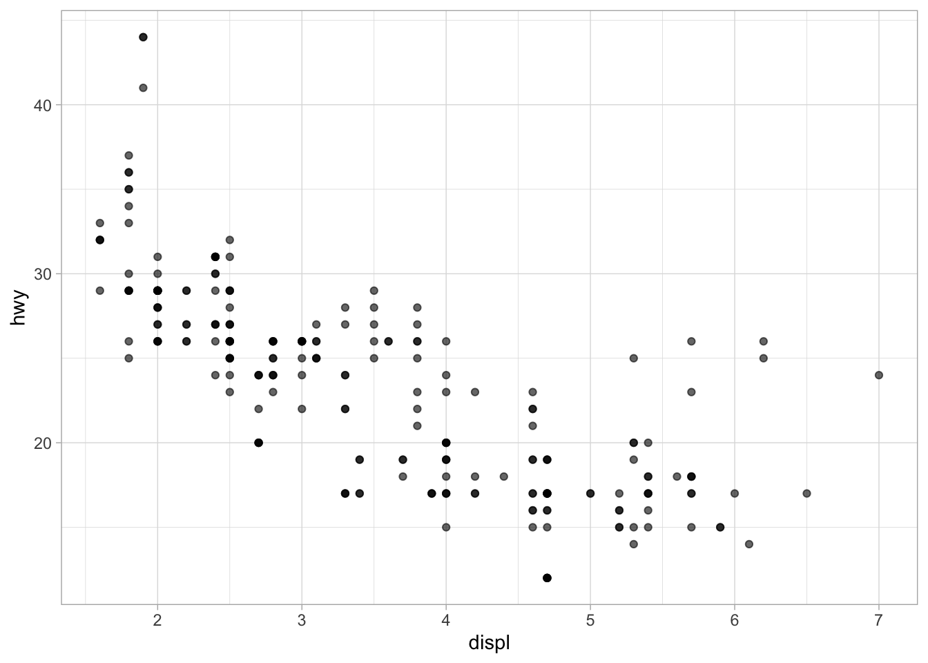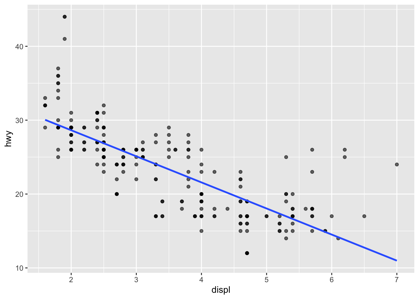 ggplot(mpg, aes(x = displ, y = hwy)) +