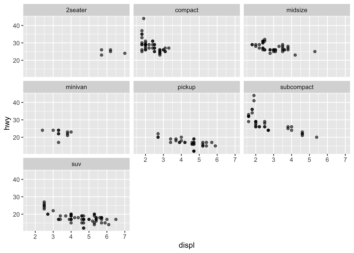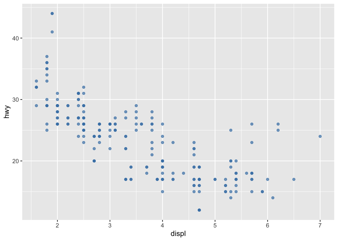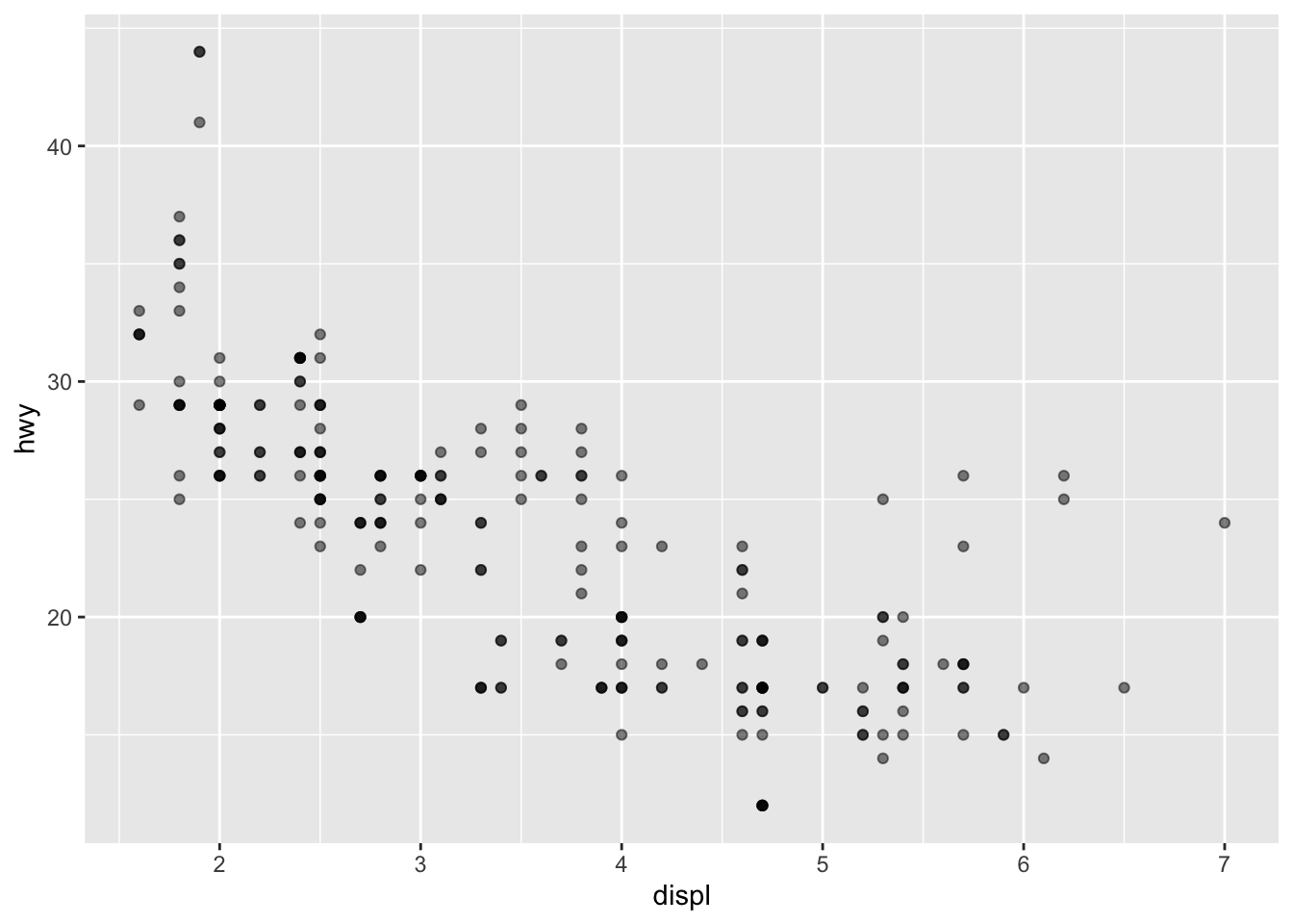 aes): how variables map to visual elementsWe will use the built-in dataset mpg (fuel economy data).