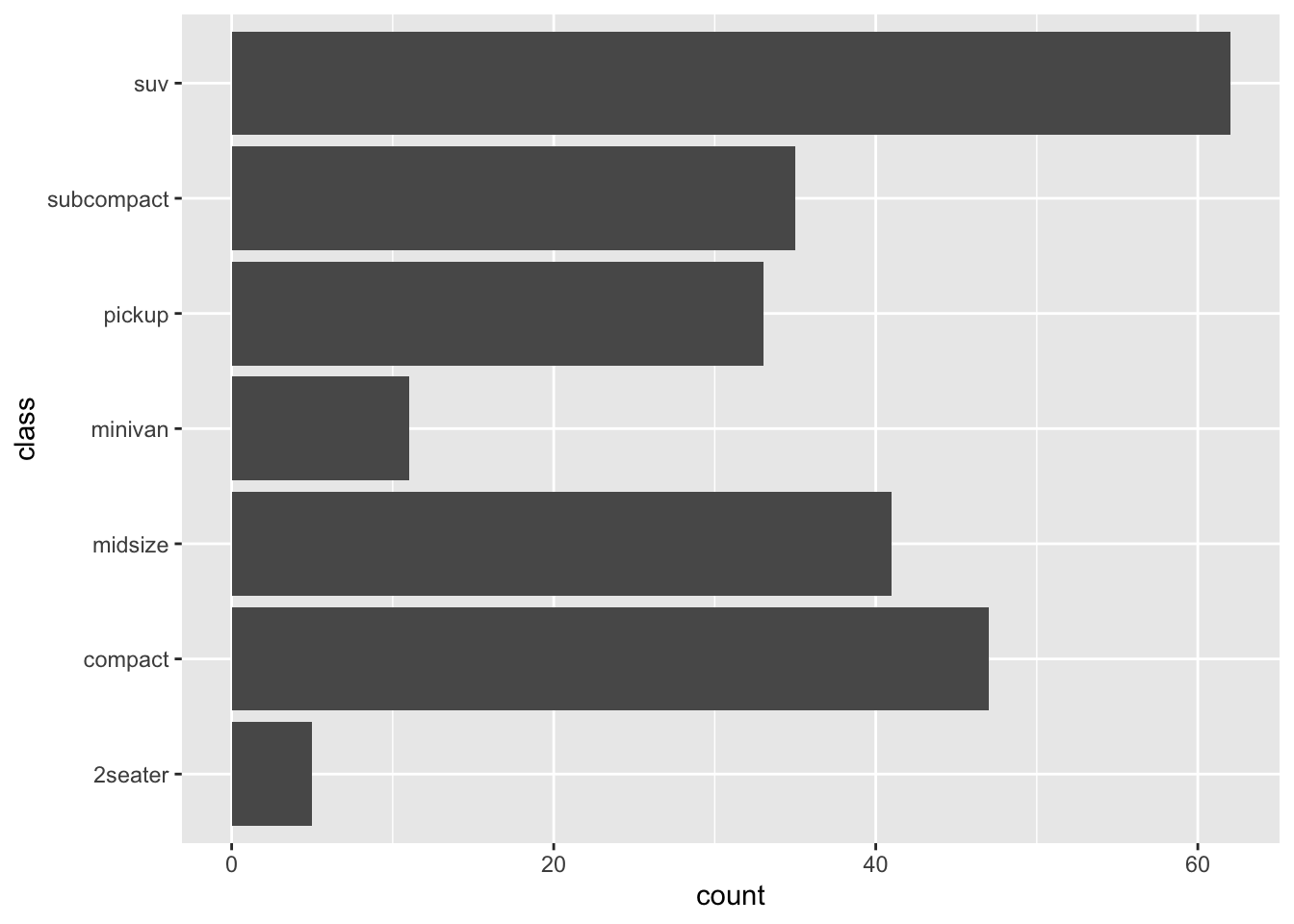 5. Create a bar chart of `manufacturer`. Flip the axis using `coord_flip()`.