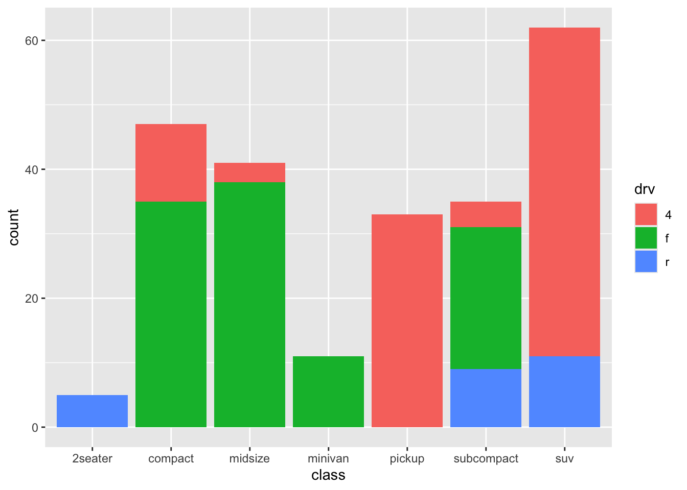 ggplot(mpg, aes(x = class, fill = drv)) +