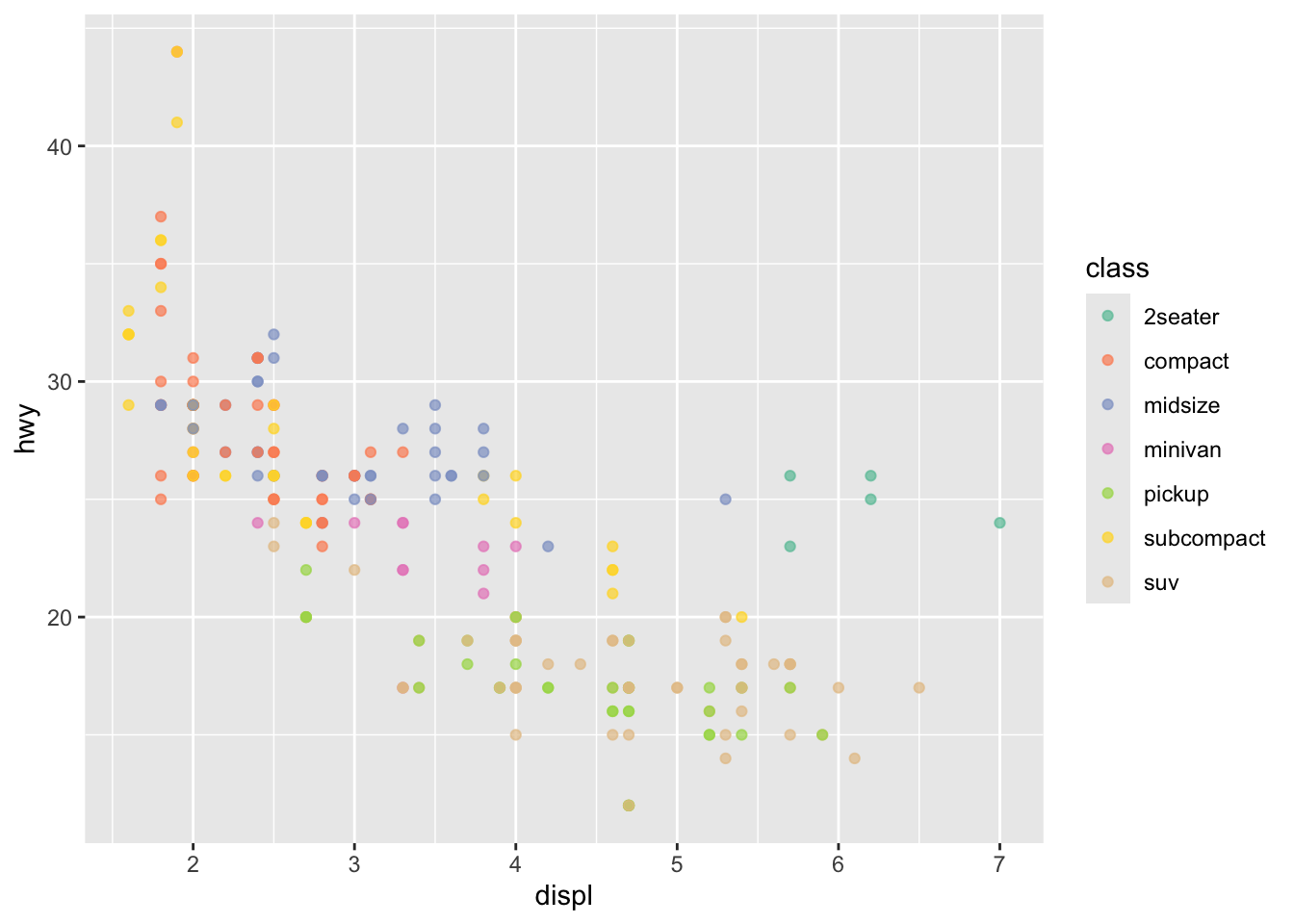 ggplot(mpg, aes(x = displ, y = hwy, color = class)) +