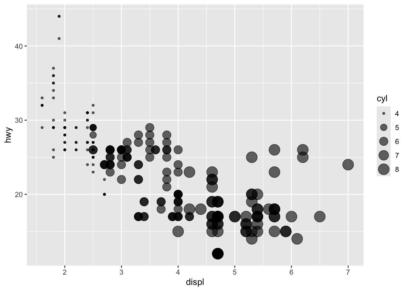 ggplot(mpg, aes(x = displ, y = hwy, size = cyl)) +
