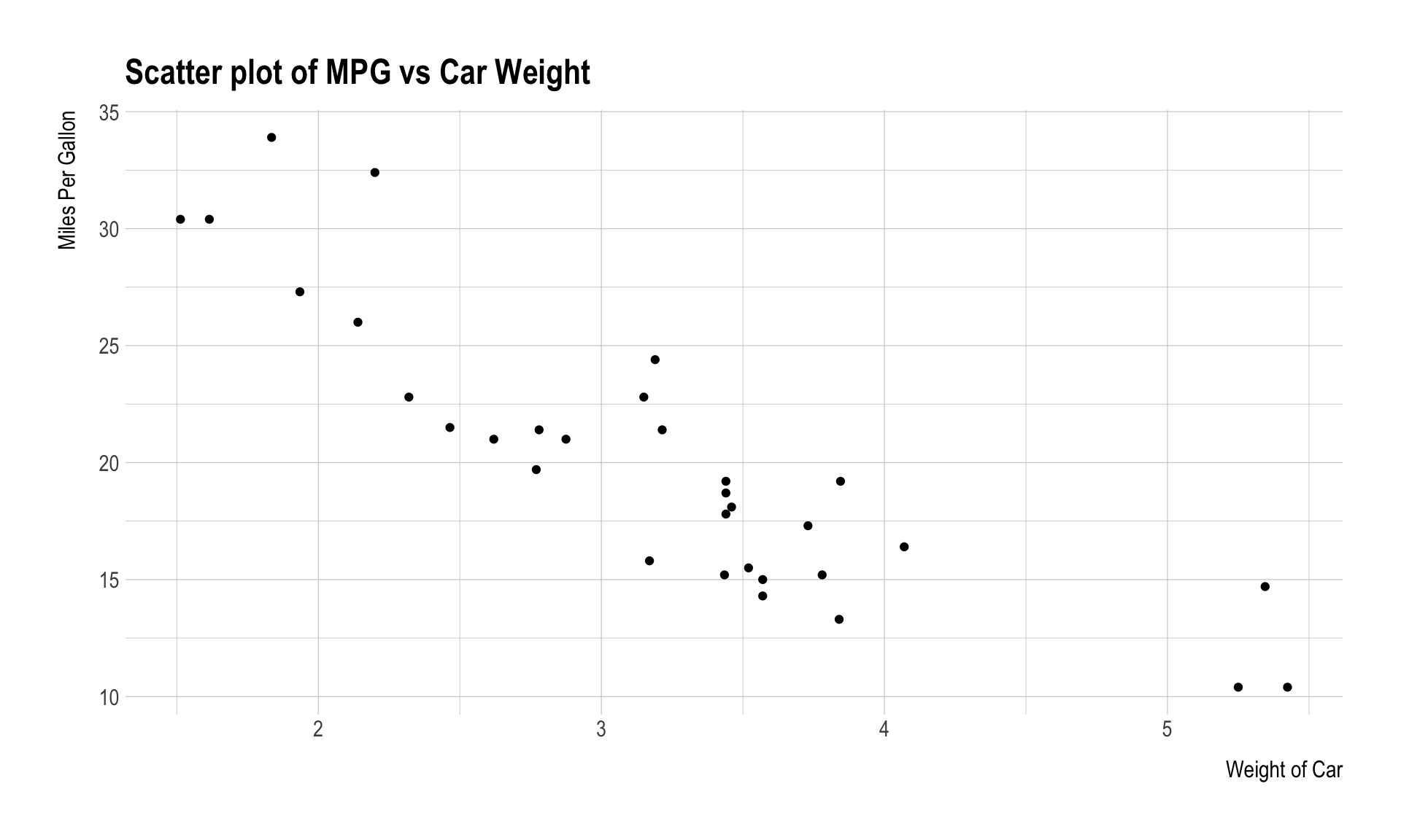labs(x = "Weight of Car", y = "Miles Per Gallon",