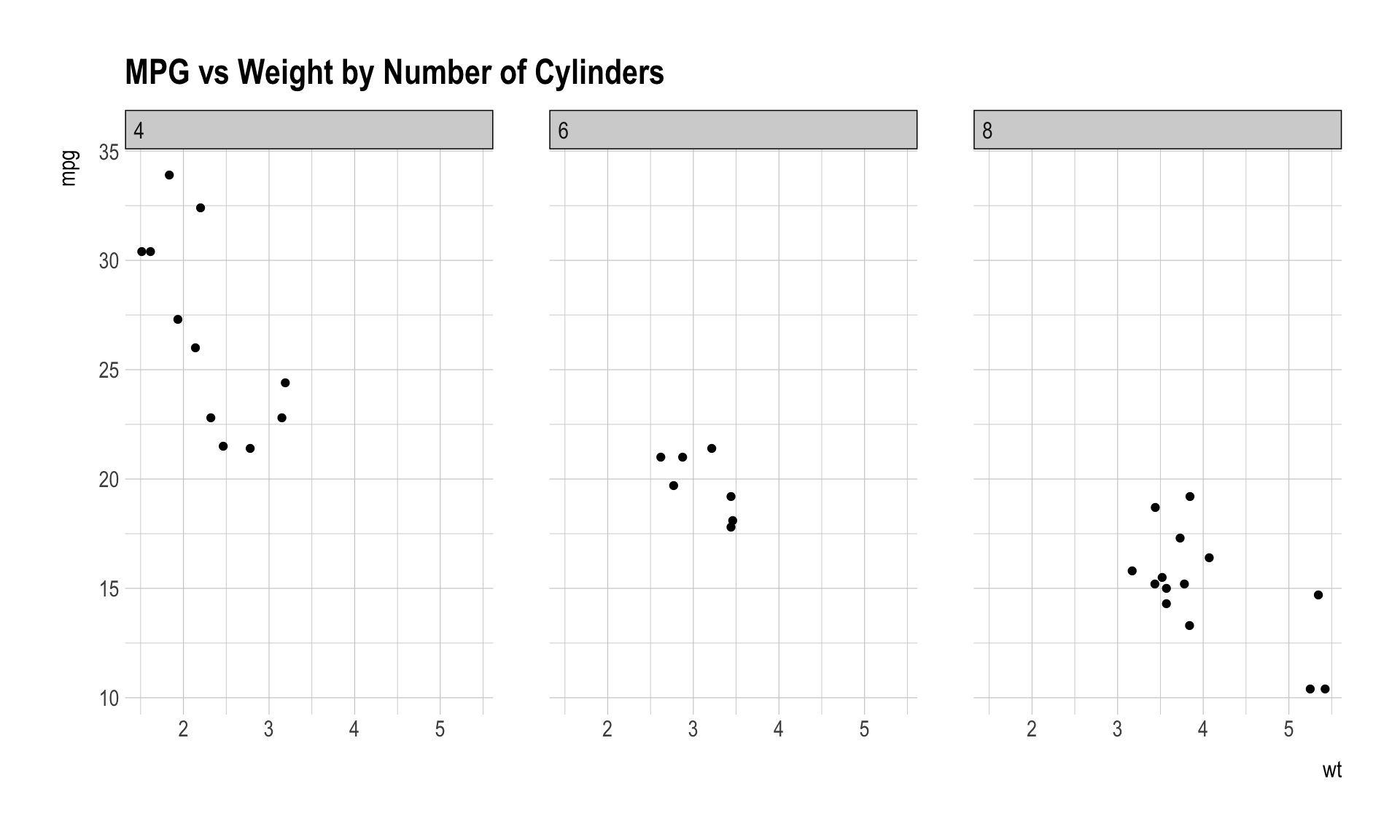 Creating a faceted plot to compare scatter plots of `mpg` vs `wt` across different numbers of cylinders.